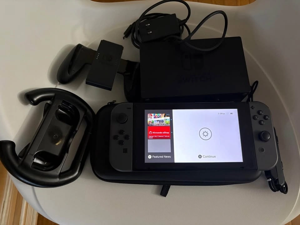 Comes with everything shown in the photos: Dock, original Joy-Cons, Joy-Con straps, Joy-Con grip, original charger, and travel case. Shows normal wear from use. Cash only, pick up in Markham near 16th Ave and 9th Line.