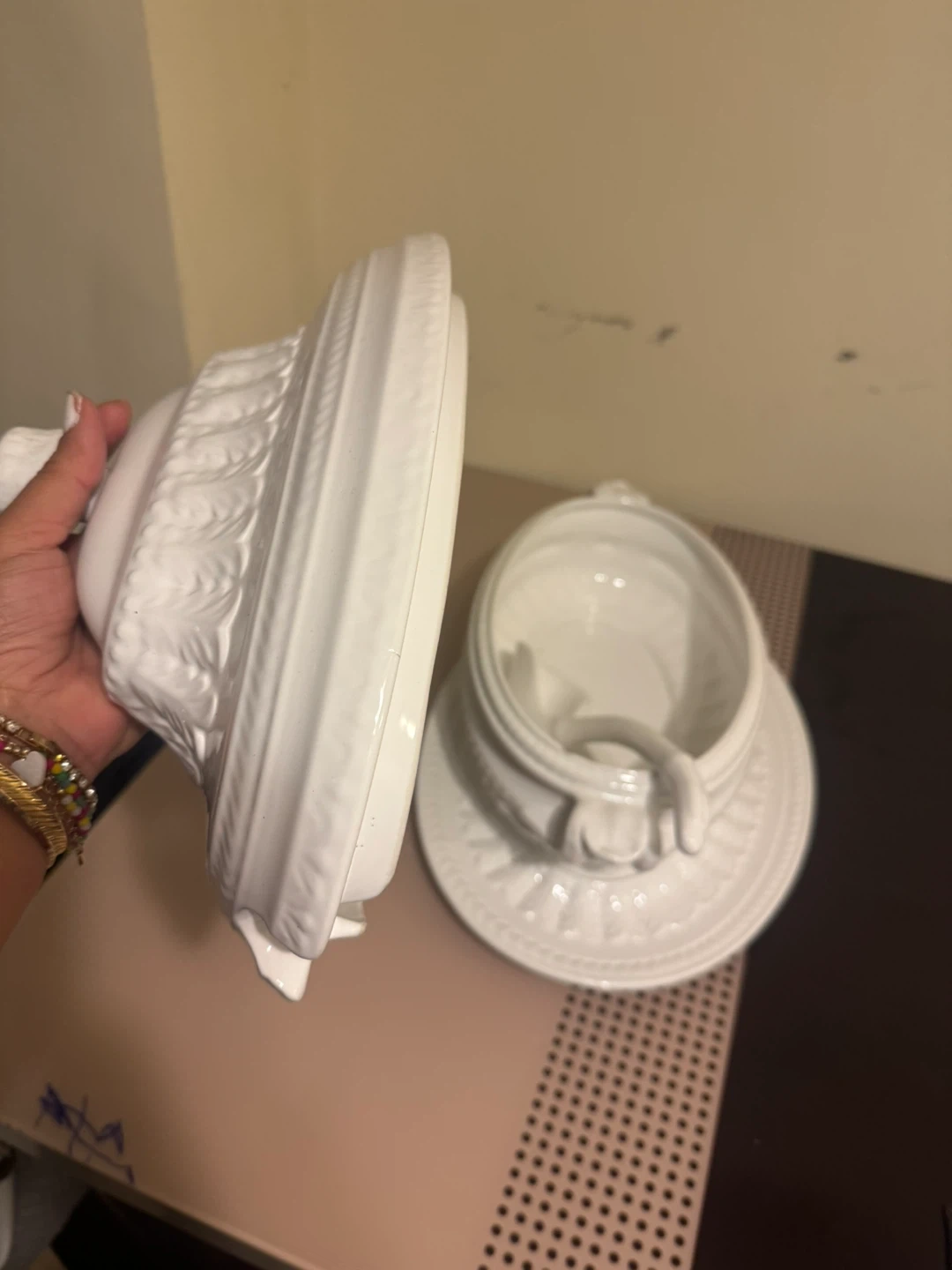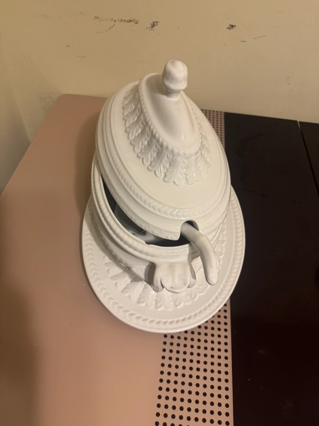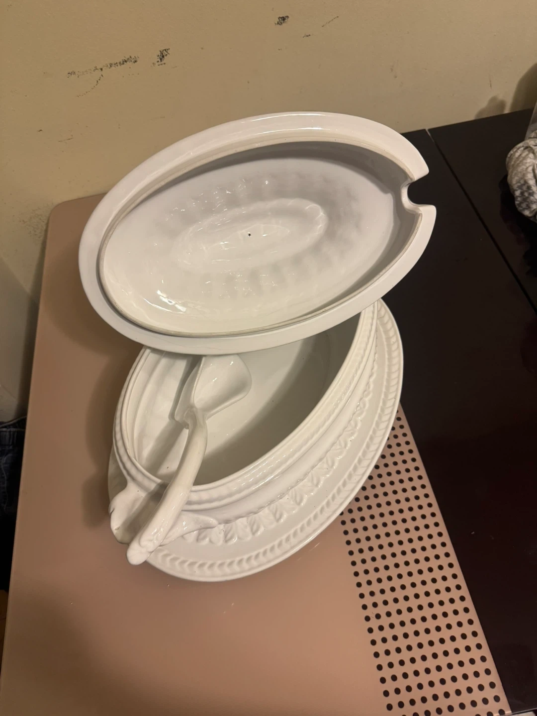 White ceramic tureen with a matching lid and ladle. It's perfect for serving soups or stews. The set includes the tureen, lid, and a ladle.