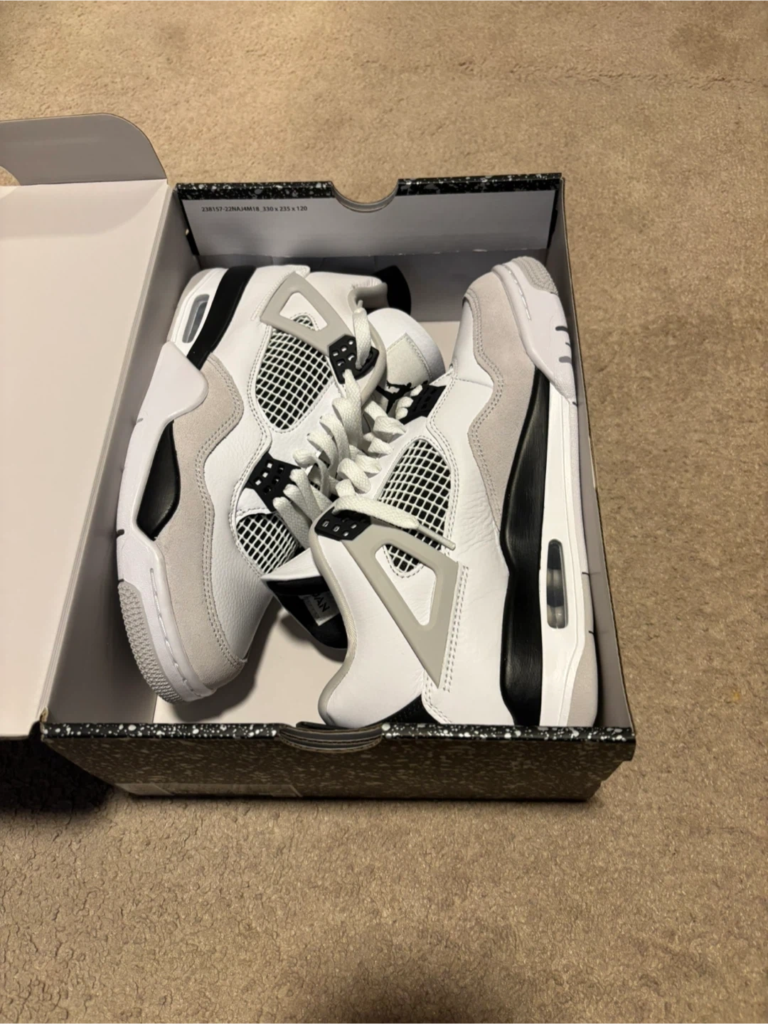 Here are some Air Jordan 4 Retro Military Blacks. This pair is a men's size 9 (UK 8, EUR 42.5). They come in their original box. 100% real from hotbox the store.