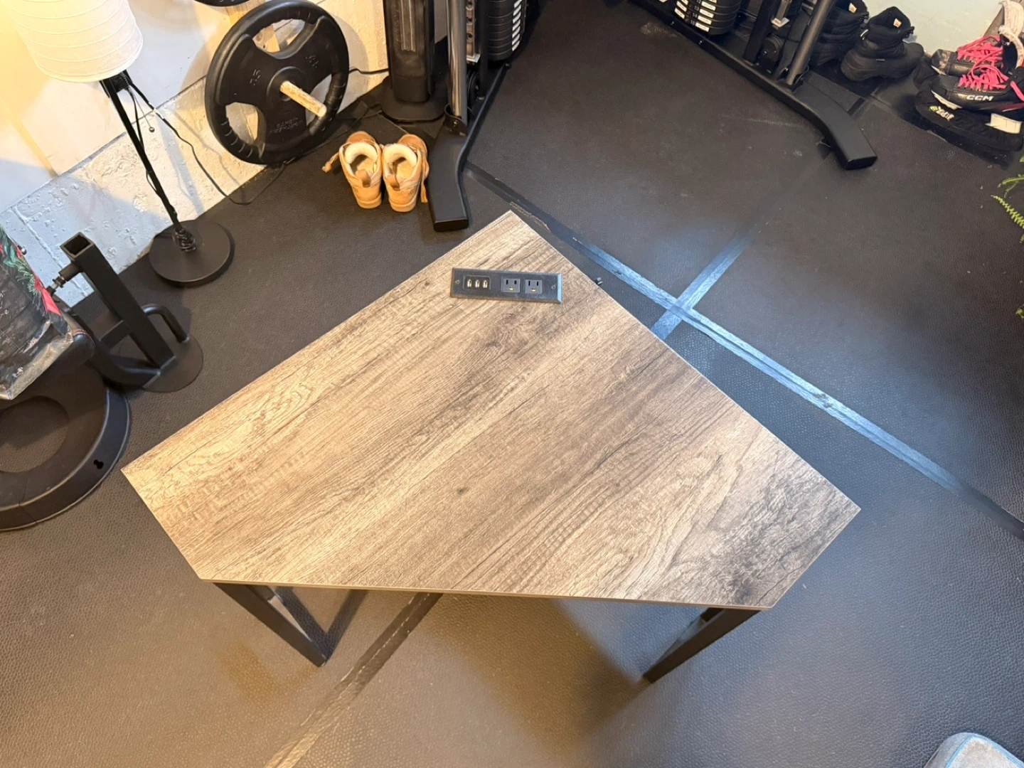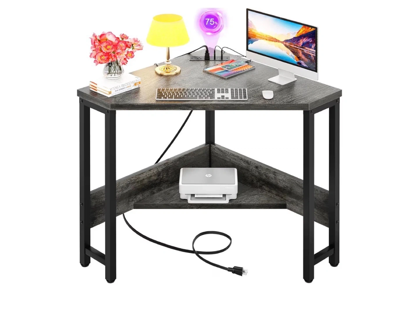 This corner desk offers a space-saving design with a rustic grey wood finish and black metal frame. It includes a built-in power strip with USB ports for convenient charging. The desk also features a lower shelf for extra storage. Its compact size makes it suitable for smaller rooms.