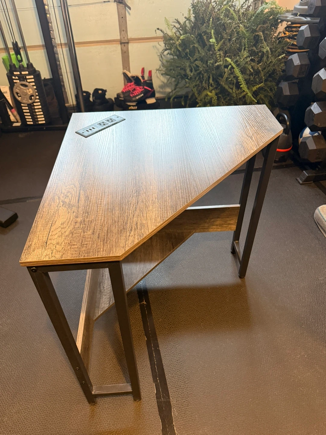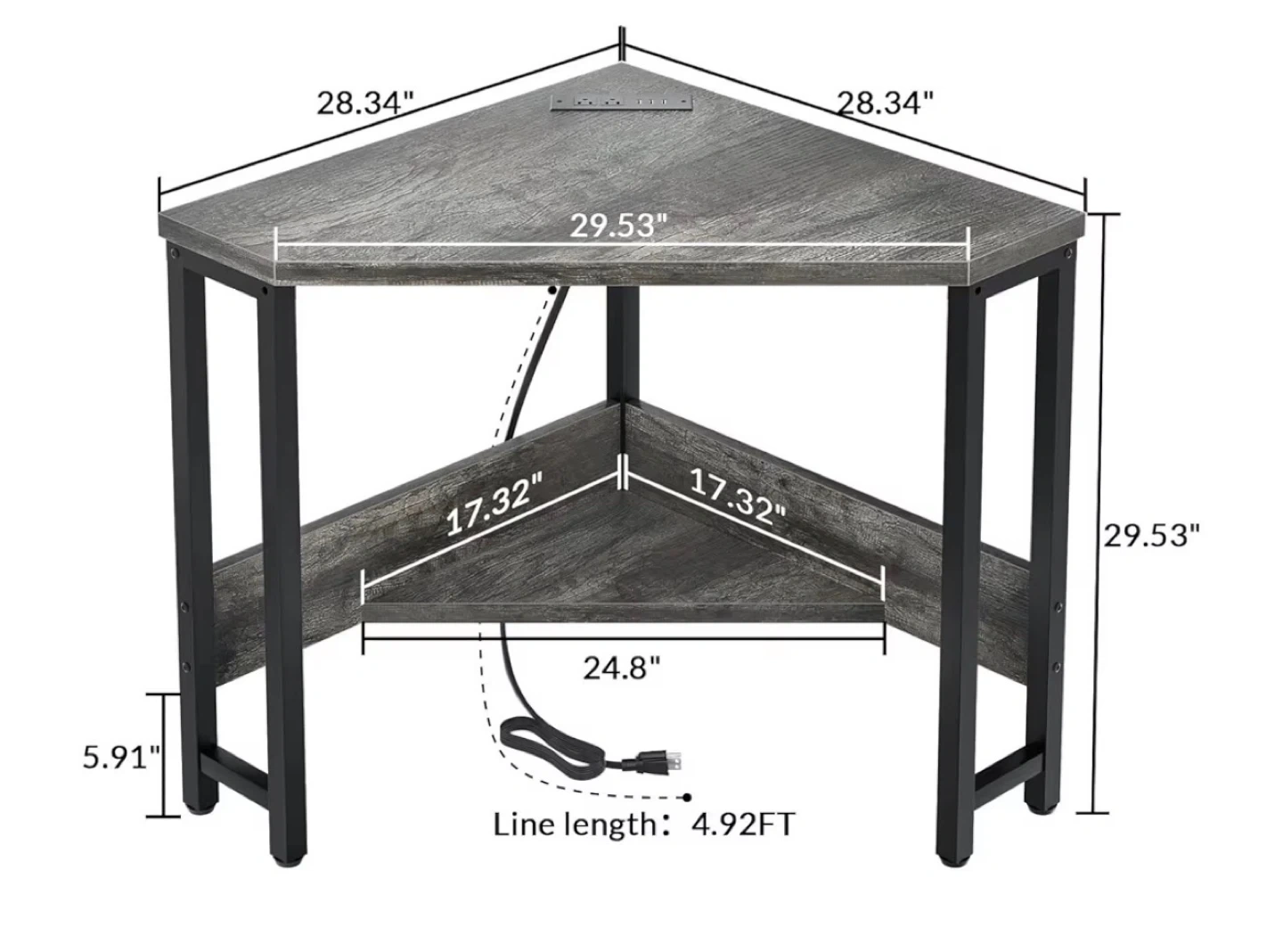 This corner desk offers a space-saving design with a rustic grey wood finish and black metal frame. It includes a built-in power strip with USB ports for convenient charging. The desk also features a lower shelf for extra storage. Its compact size makes it suitable for smaller rooms.