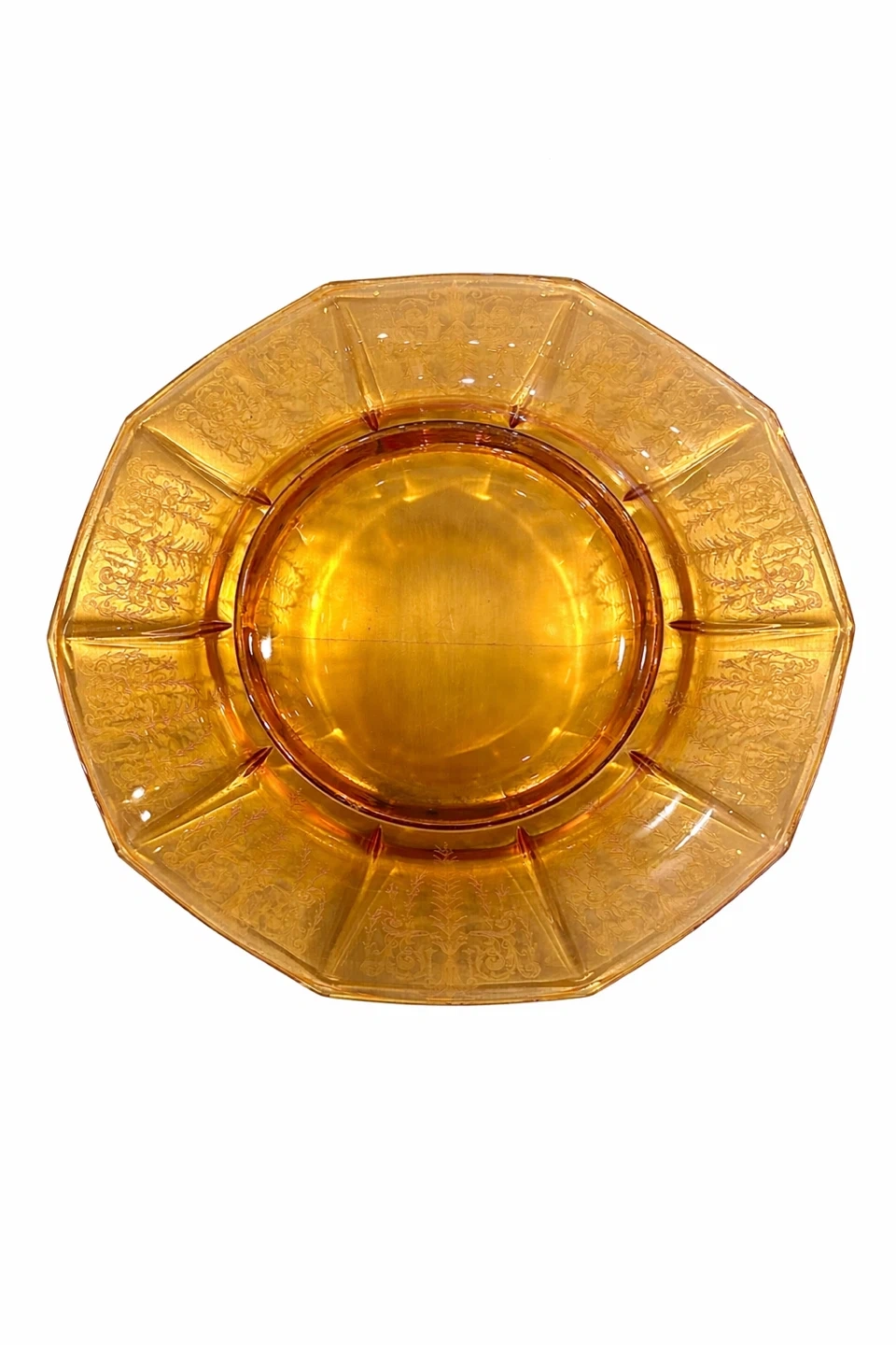 The bowl is executed in a rich amber (golden honey) glass, formed as a 10-sided decagon, a geometry strongly associated with Cambridge’s Art Deco and early Mid-Century production. Each side measures approximately 3¾ inches, creating a crisp, architectural profile that reflects light beautifully.