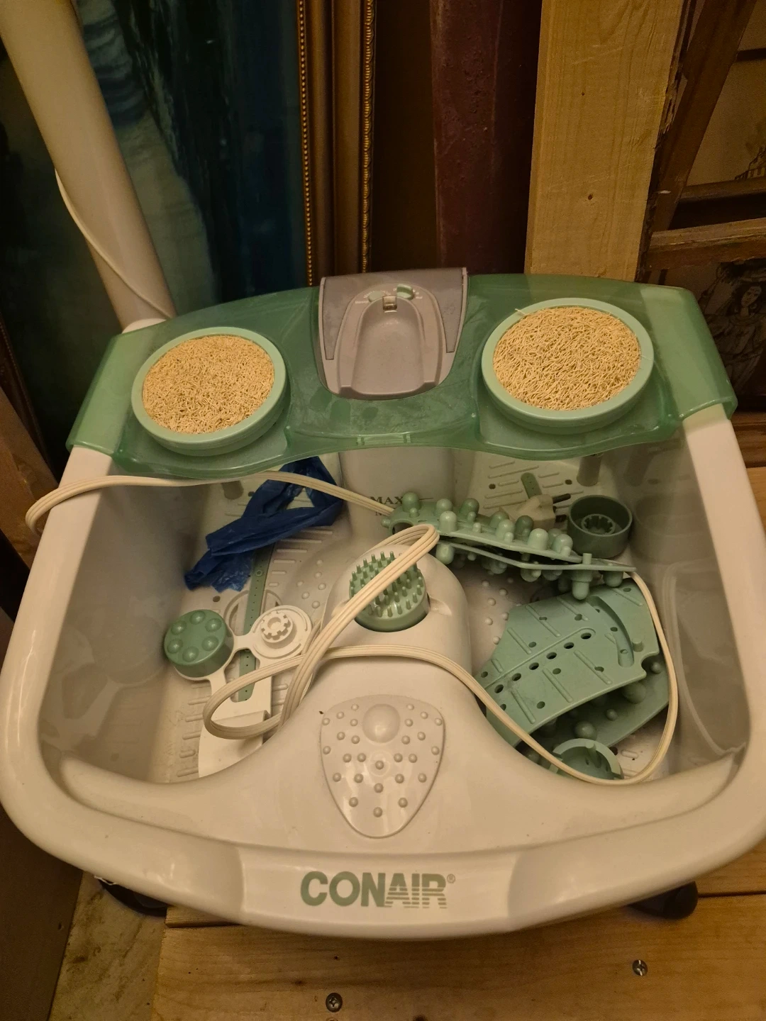 Relaxing Conair foot spa with multiple massage attachments. Features bubbling water and heat options for ultimate comfort. Includes two circular loofah pads and various rolling massagers. A great way to unwind after a long day!