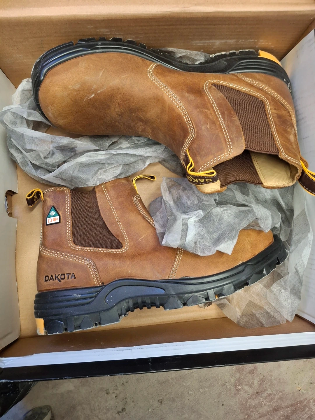Dakota men's ATCP pull-on safety work boots. Tarantula Antislip Quad Comfort style. Brown colour. Size 12. These boots offer excellent traction for work environments.