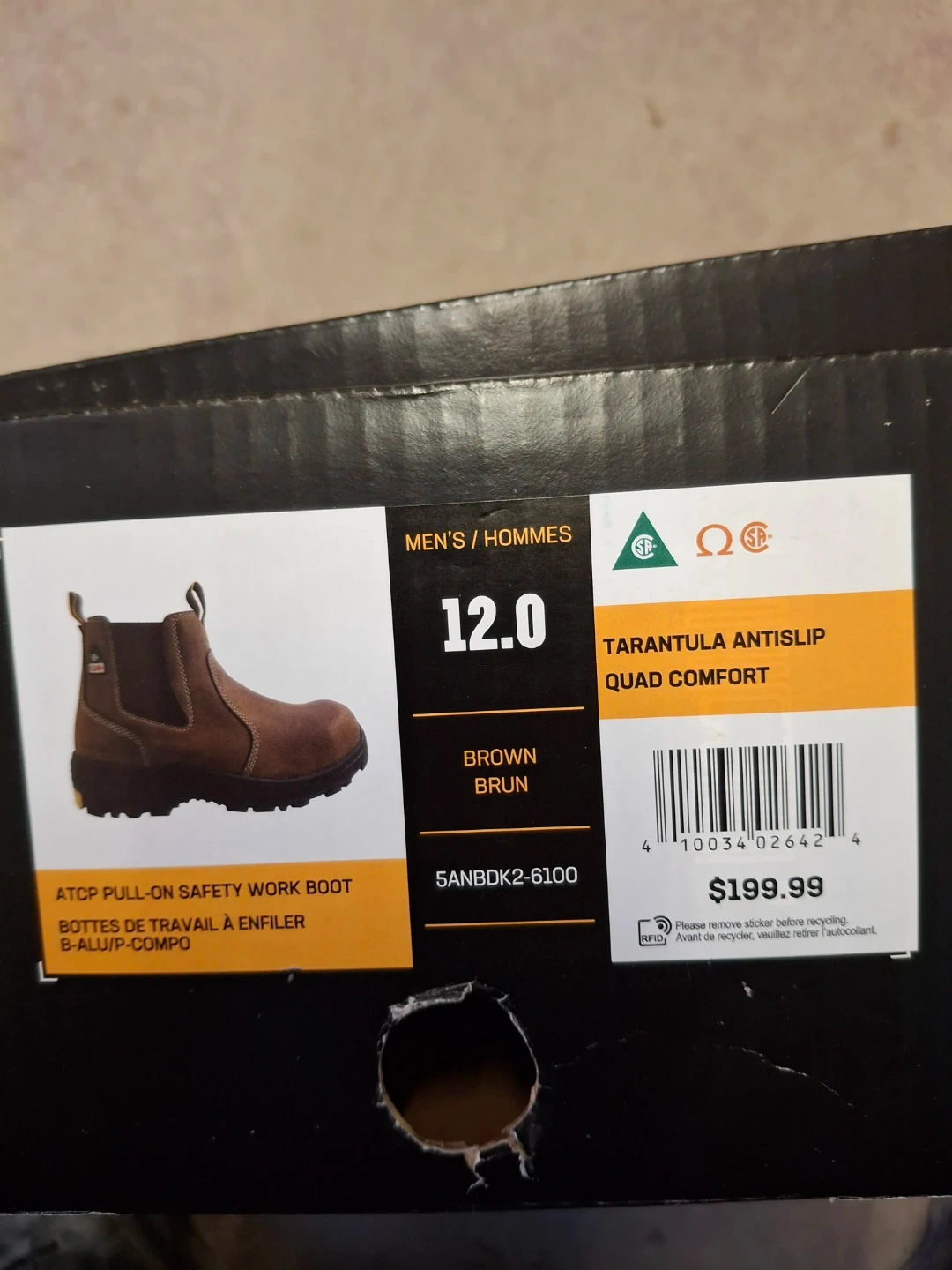 Dakota men's ATCP pull-on safety work boots. Tarantula Antislip Quad Comfort style. Brown colour. Size 12. These boots offer excellent traction for work environments.