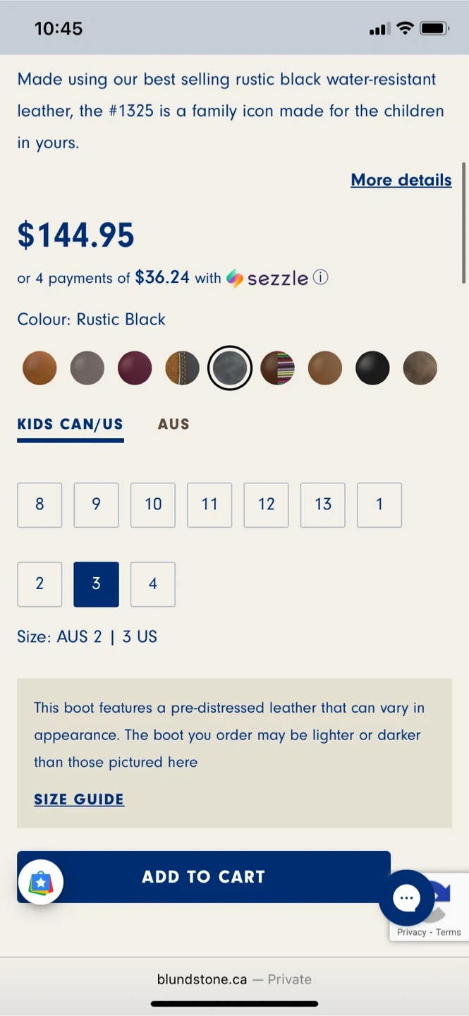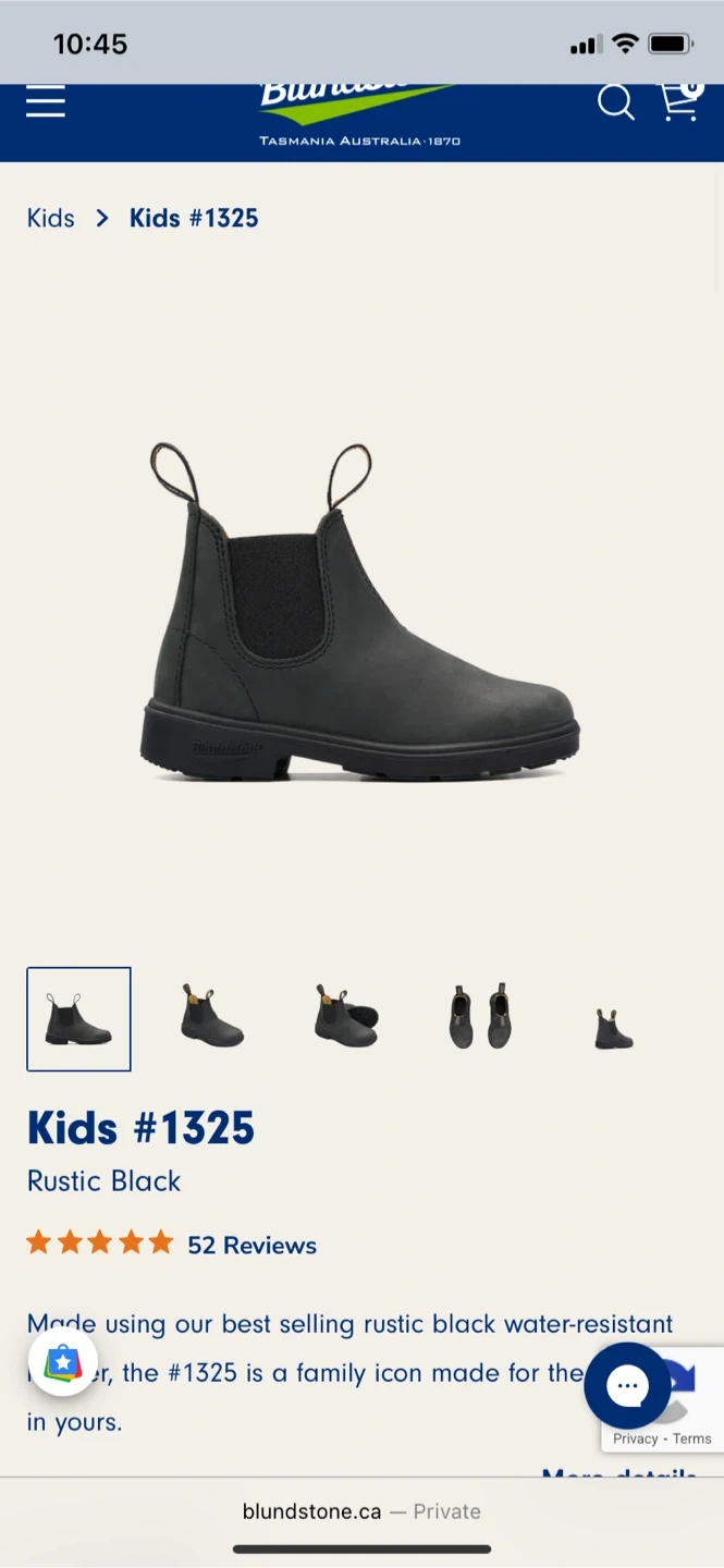 Blundstone #1325 kids' boots in rustic black. Water-resistant leather construction. These boots feature pull-on tabs and elastic side panels. Oil and acid resistant sole. Slightly dirty sole but will be cleaned before pickup!