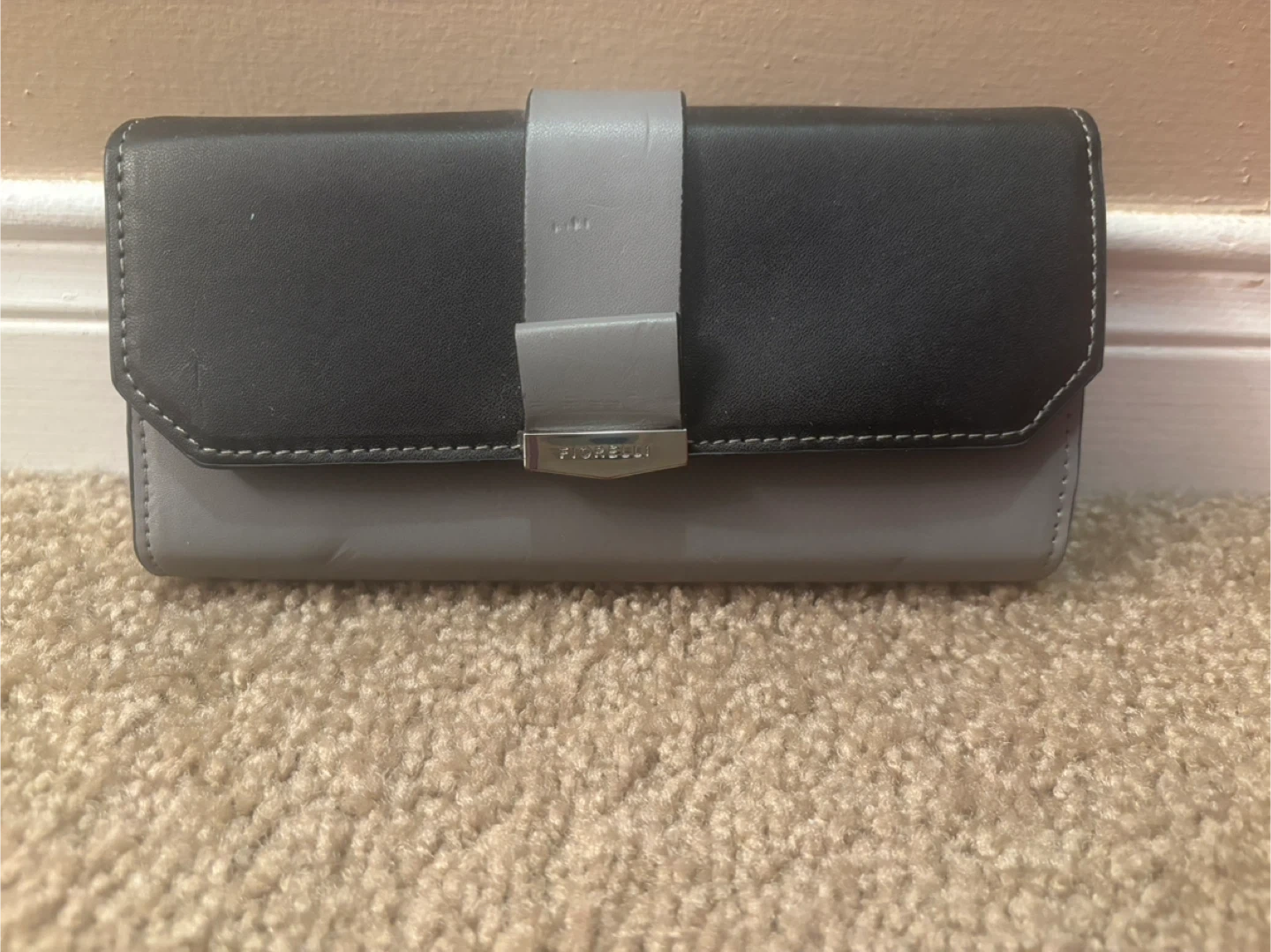 Fiorelli wallet with a two-tone black and grey design. It's made of faux leather with a secure clasp closure. This wallet is perfect for organizing your cards and cash.