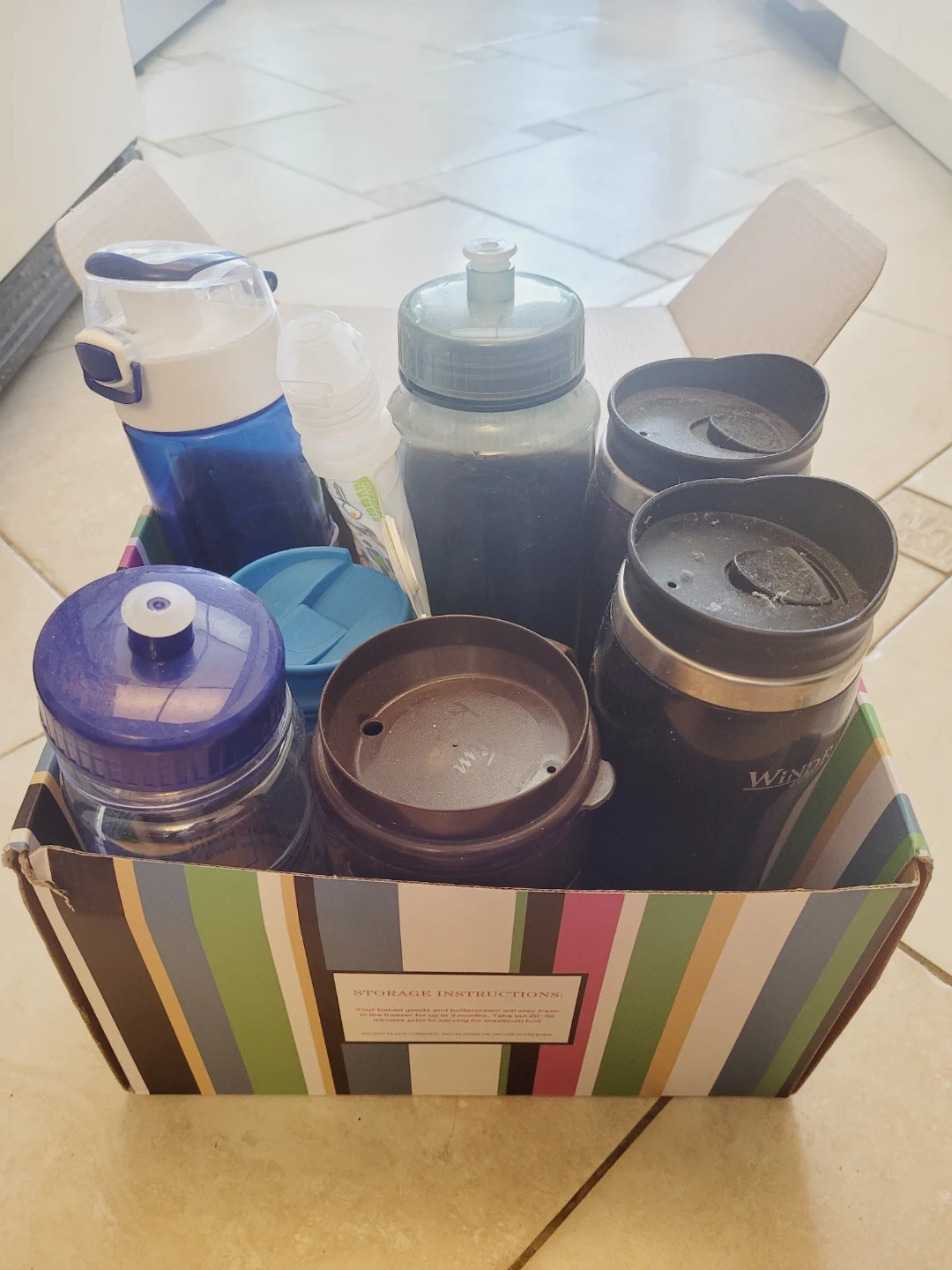 Variety of reusable water bottles and travel mugs included. Some are clear plastic, blue, and black. Different lids and sizes are present. Great for staying hydrated on the go!