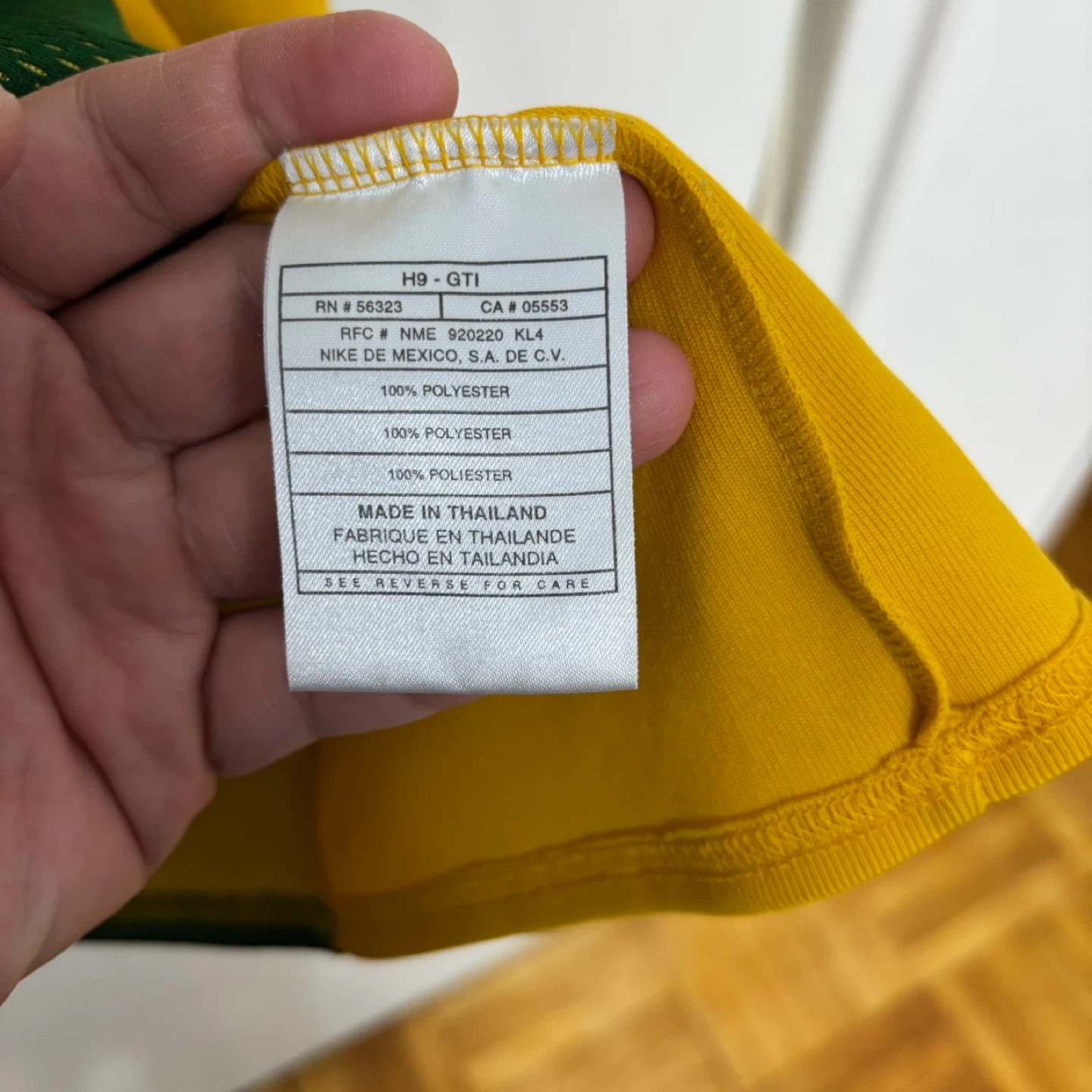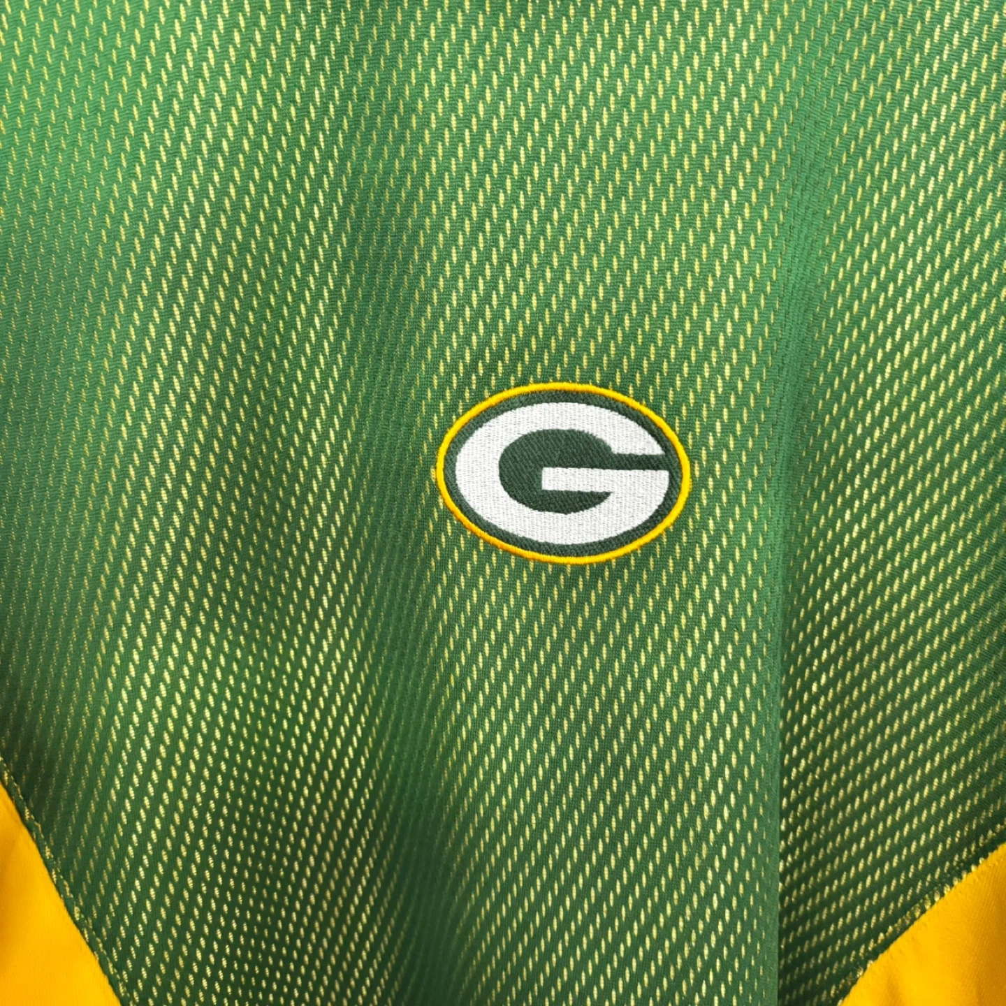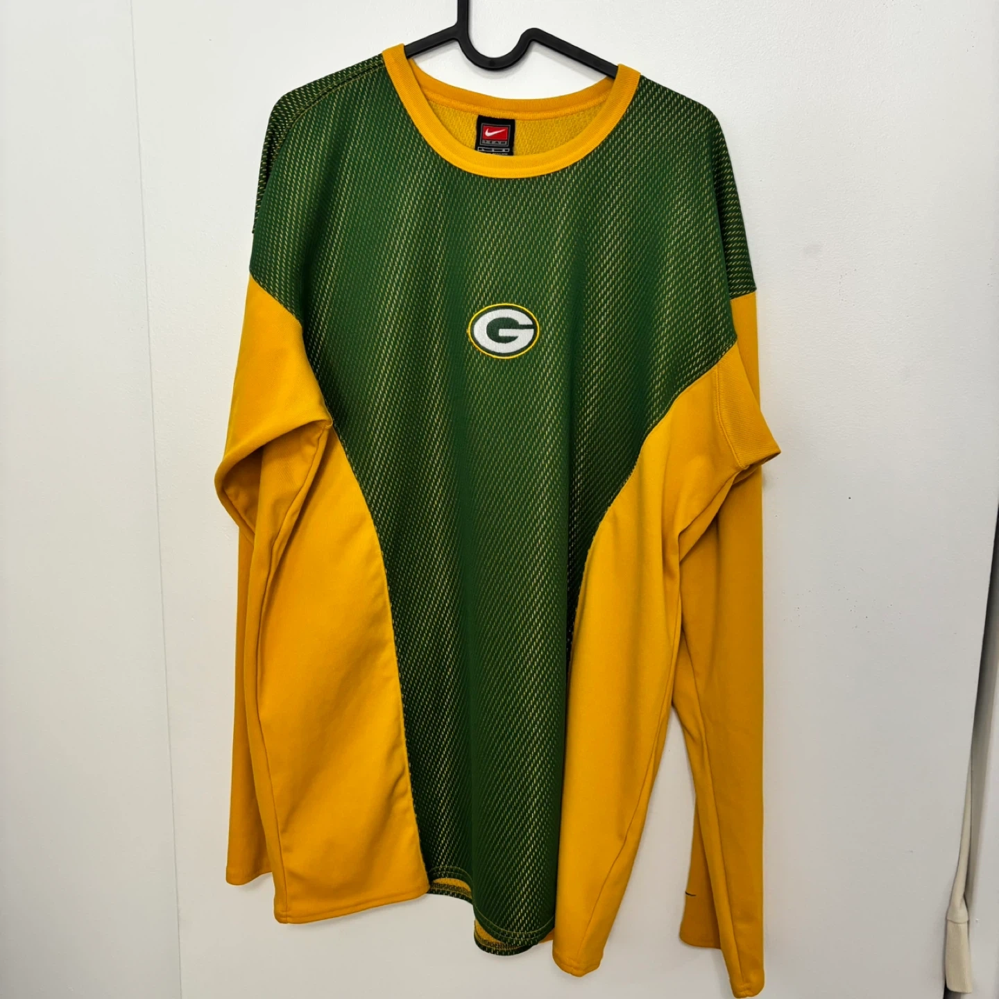 This Nike long sleeve shirt features the Green Bay Packers logo. It's green and yellow with a textured mesh panel on the front. Made in Thailand.