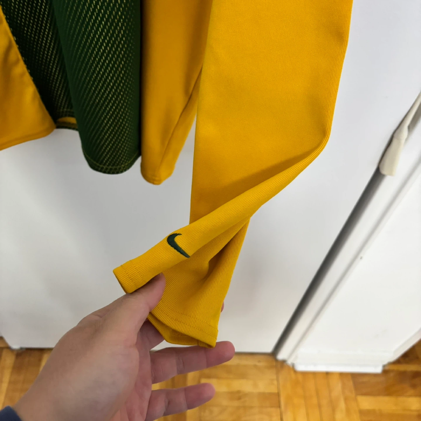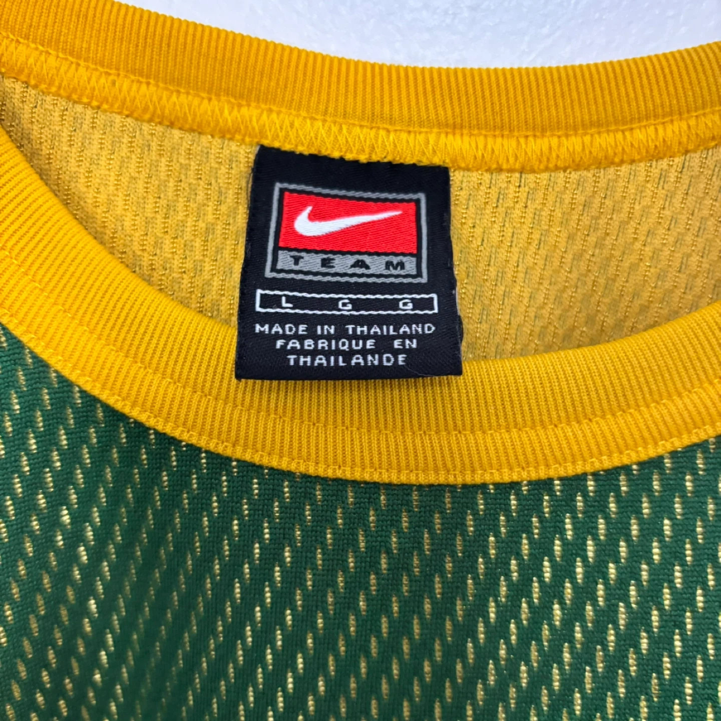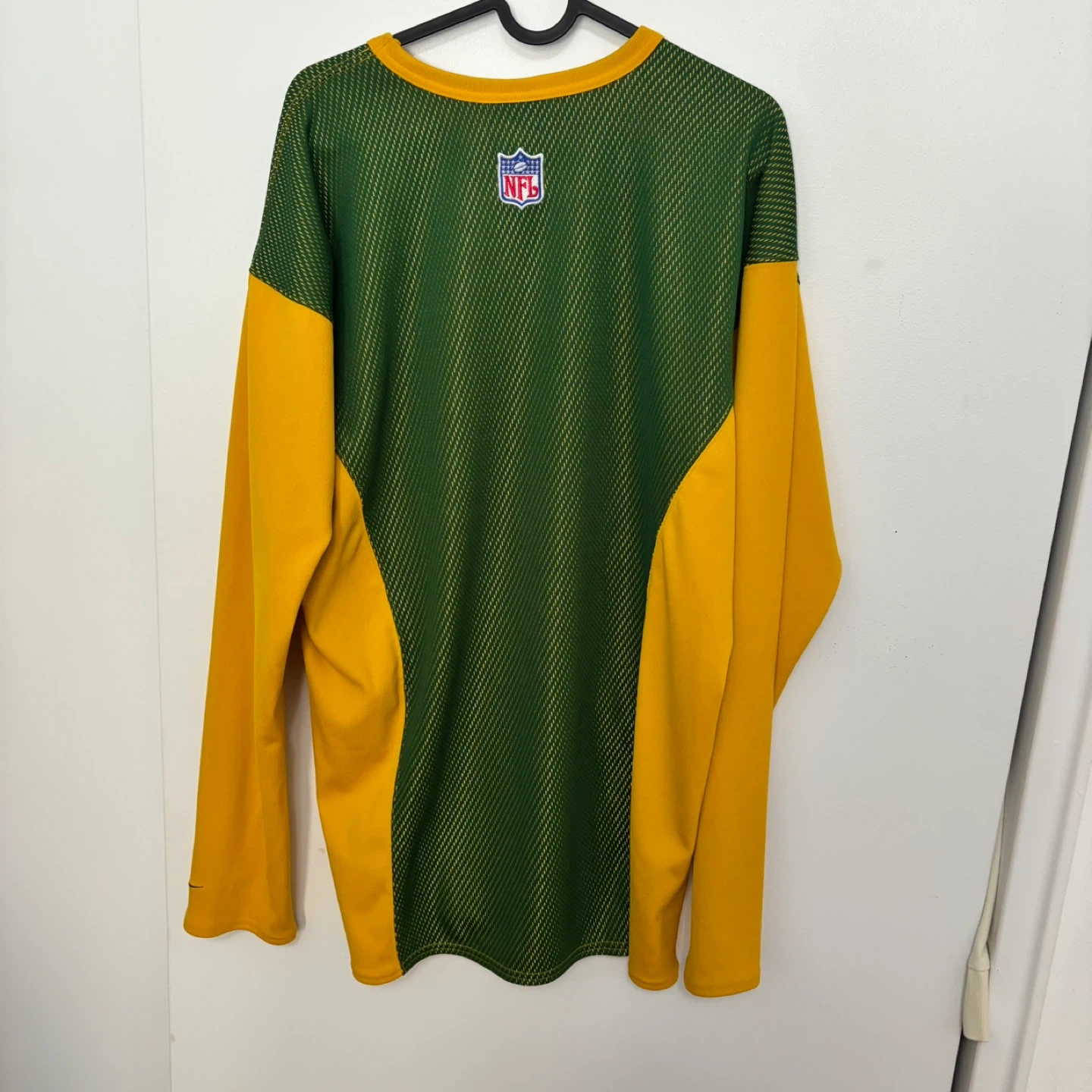 This Nike long sleeve shirt features the Green Bay Packers logo. It's green and yellow with a textured mesh panel on the front. Made in Thailand.