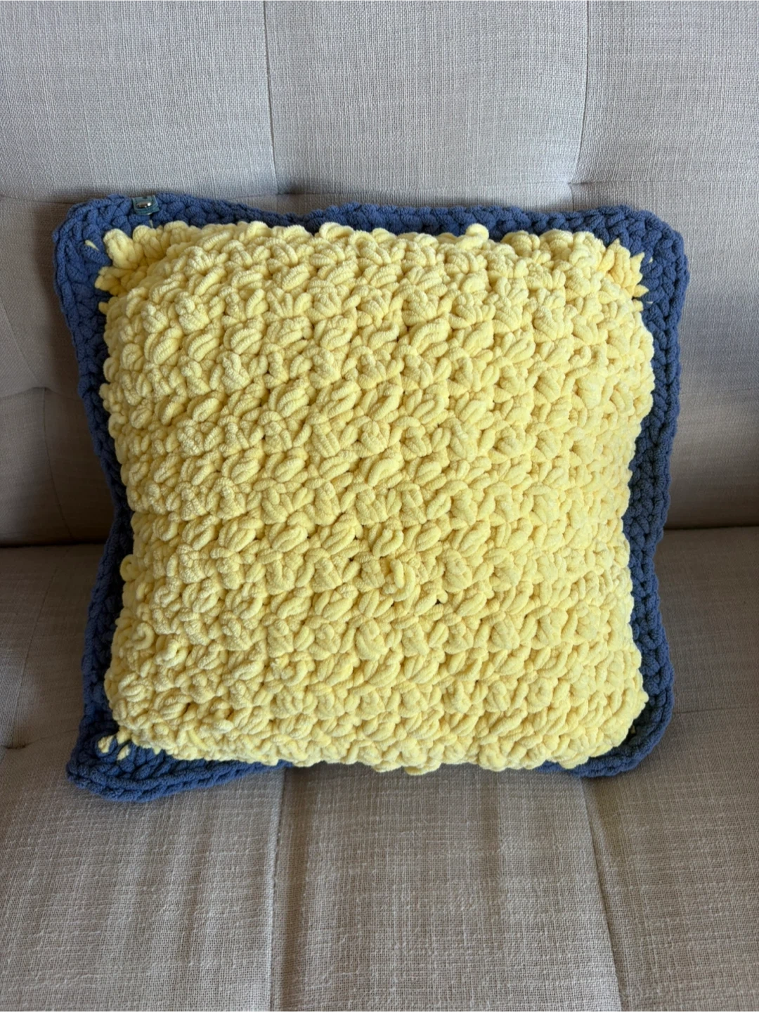 Cozy up your space with this charming handmade throw pillow. It features a soft, chunky knit texture in a cheerful yellow with a contrasting blue border.