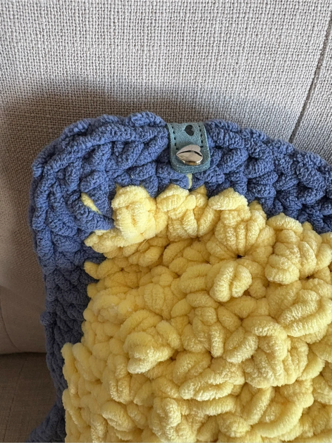 Cozy up your space with this charming handmade throw pillow. It features a soft, chunky knit texture in a cheerful yellow with a contrasting blue border.