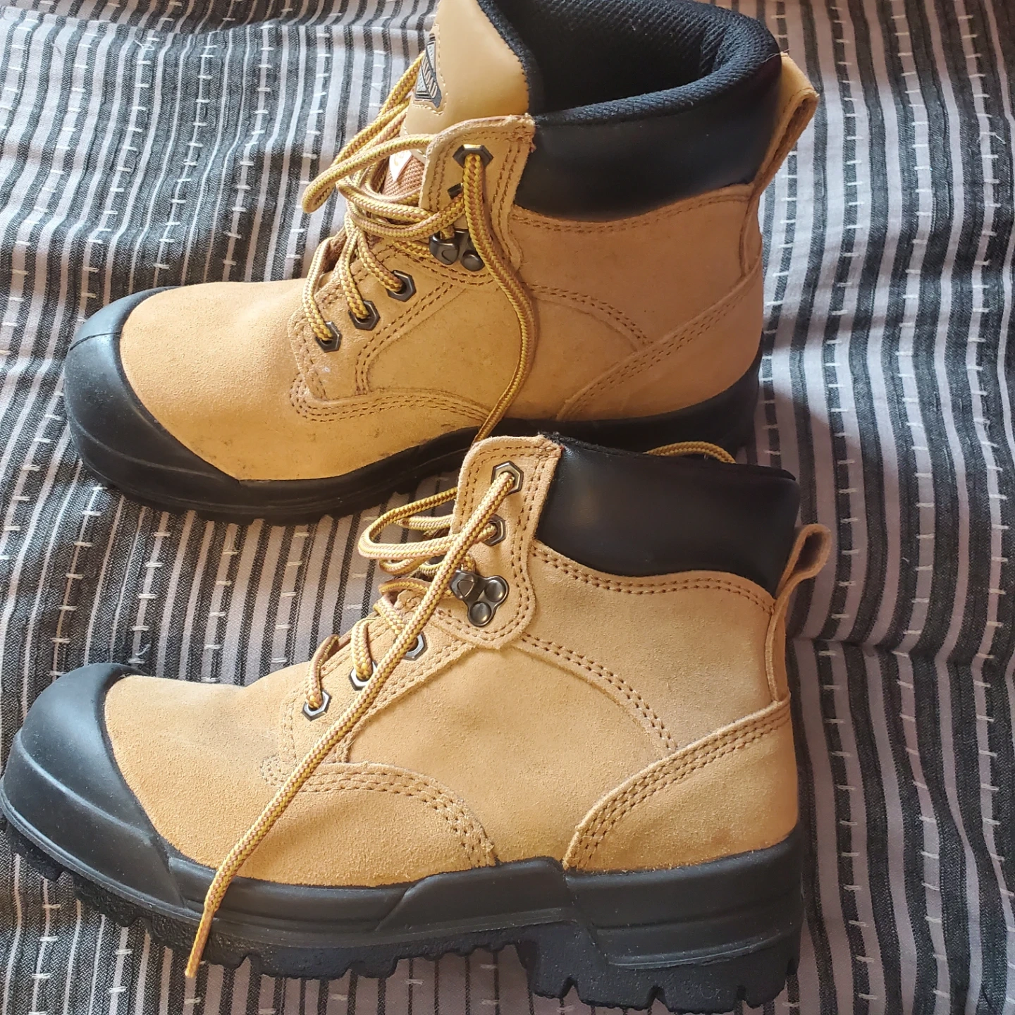 These are tan suede steel toe work boots. They have yellow laces and black soles. Excellent for construction or any tough jobsite!. Worn once.