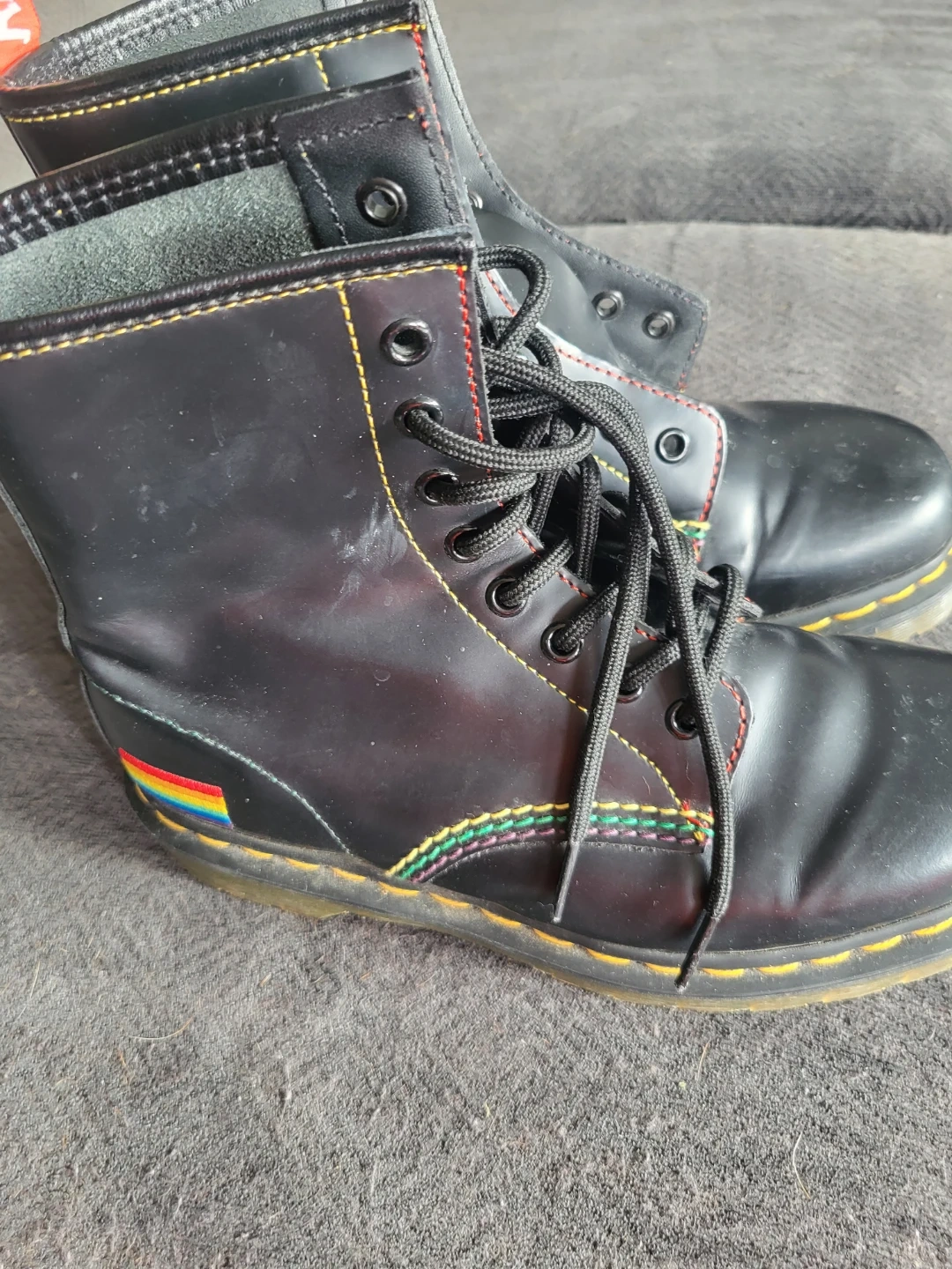 Dr. Martens 1460 combat boots. These feature the iconic rainbow stitching detail. Leather material with rubber sole. Manufactured in Thailand. They're a women's US size 7.missing one lace