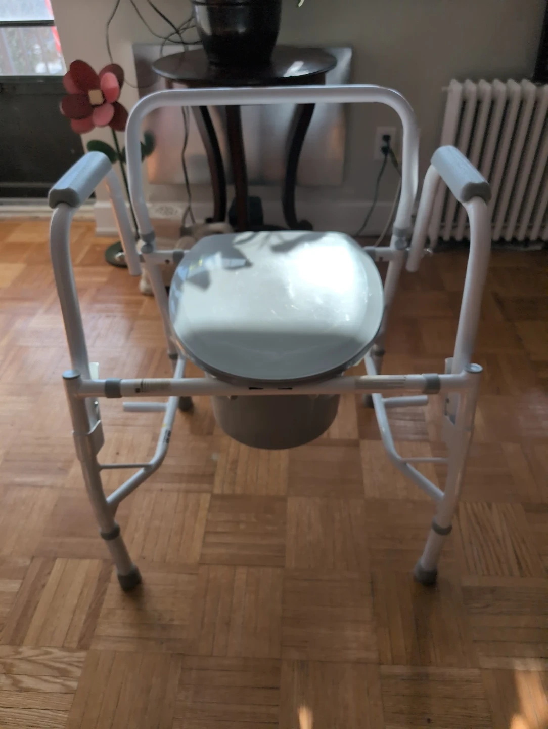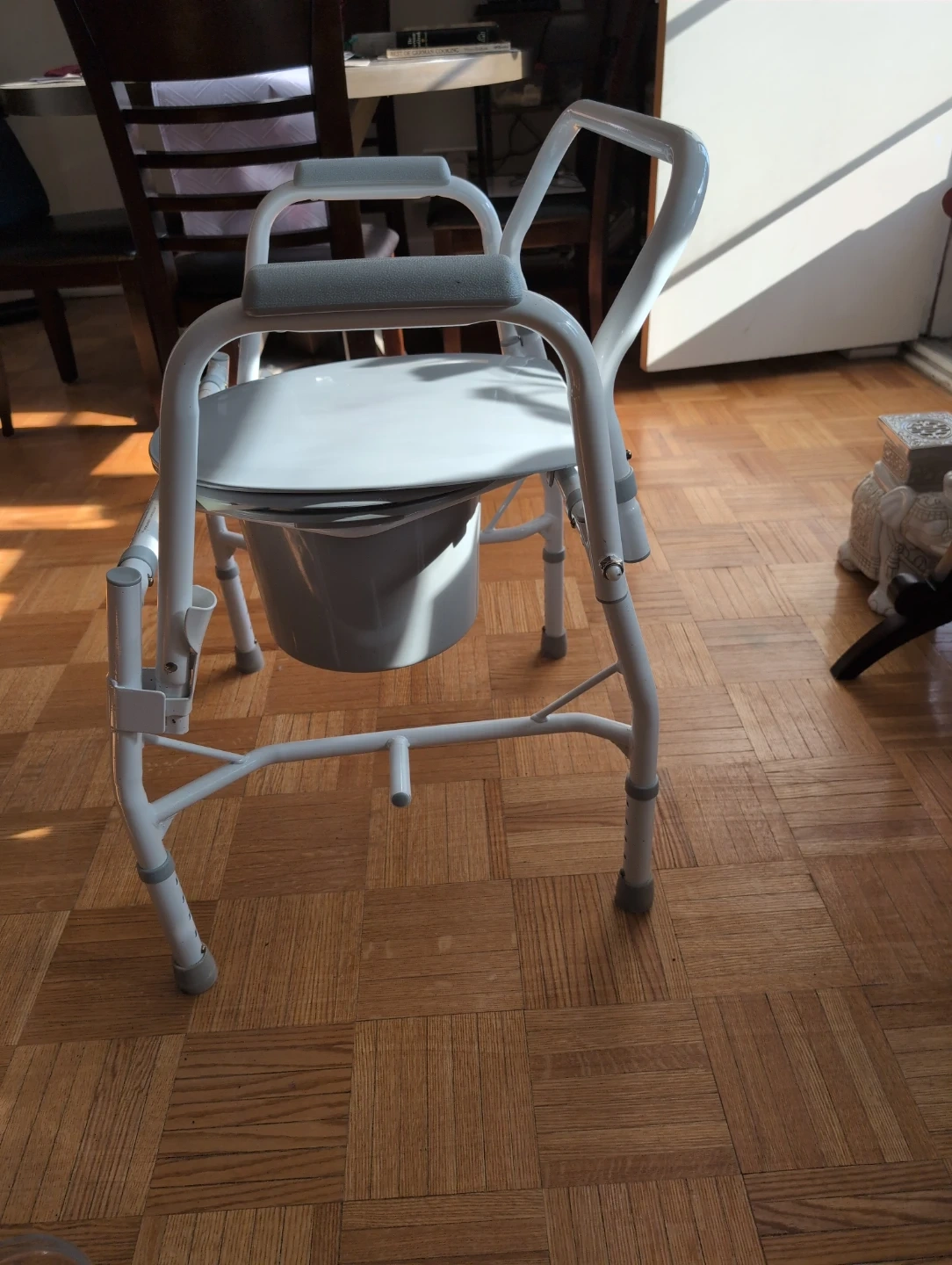 This is a folding commode chair. It's made of metal and plastic. The chair is adjustable in height for user comfort. It folds for convenient storage and transport.