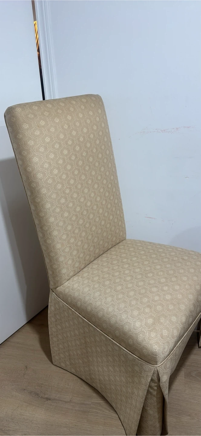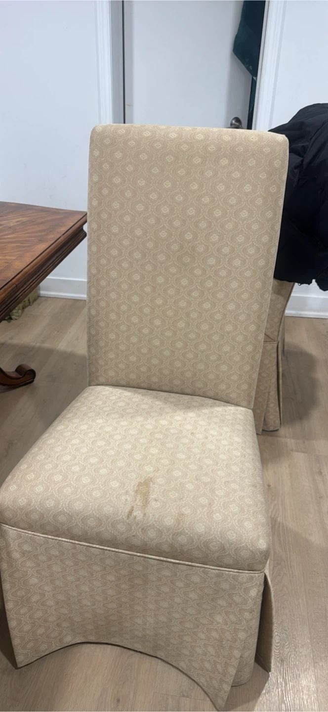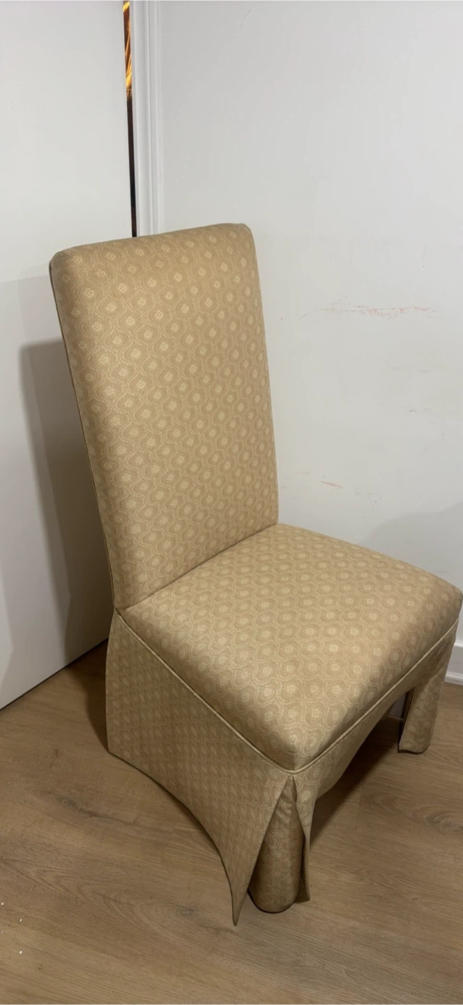 This dining chair features a patterned beige upholstery. It has a skirted base and a high back. Some staining is visible on the seat cushion.