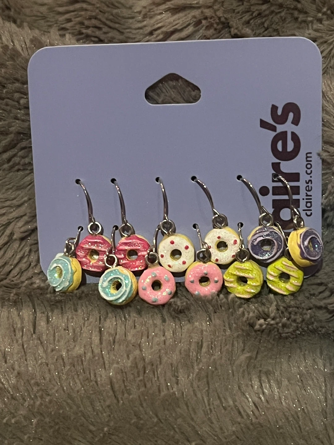 Set of cute donut-themed earrings from Claire's. It includes several pairs of dangle and stud earrings in various colours and designs. These are fun accessories for everyday wear!