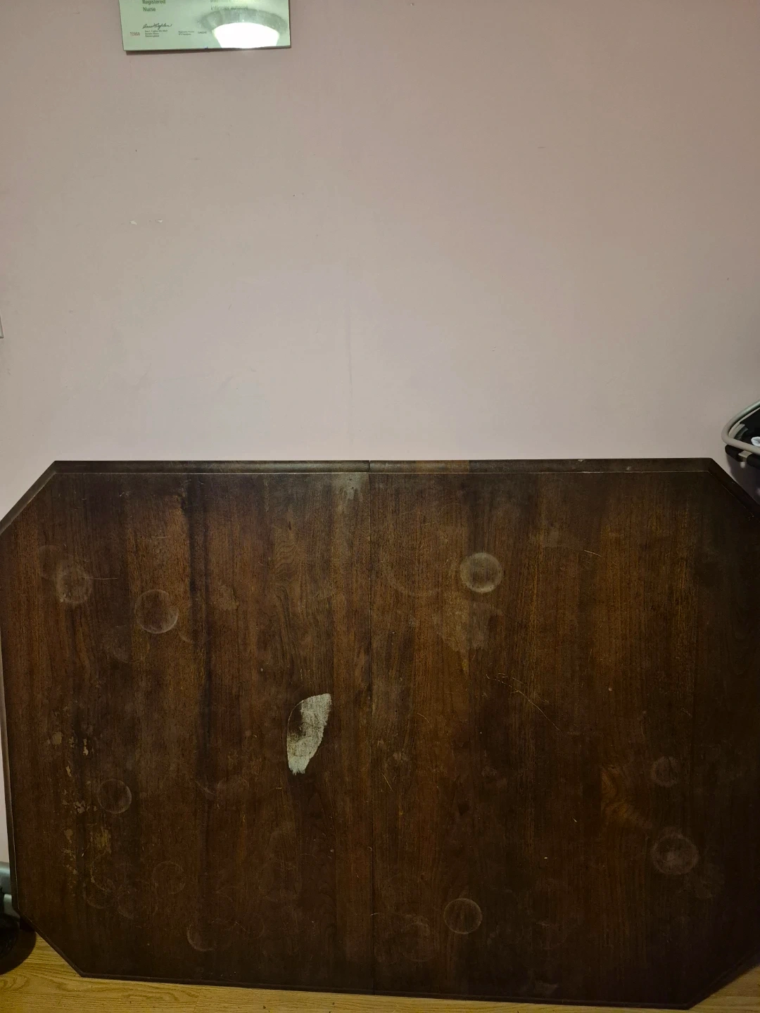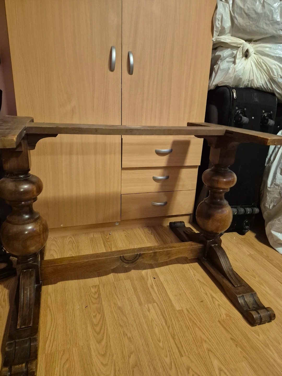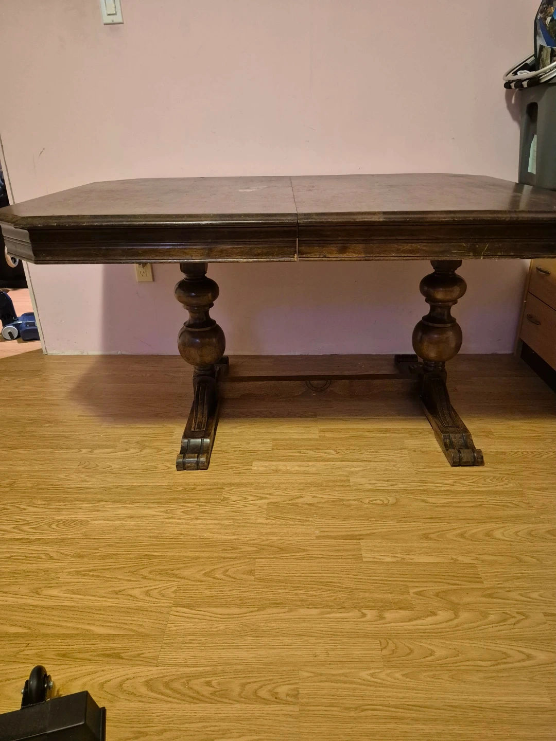 This is a sturdy wooden dining table base with a separate table top. The base has turned legs and decorative detailing. The table top is a dark wood finish with some water marks. It's suitable for a dining room or kitchen.