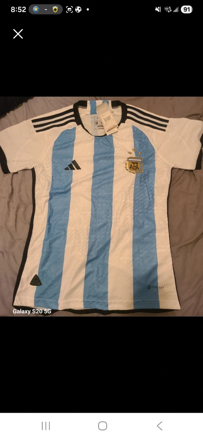 Adidas Argentina home player version jersey in white and light blue. It features the AFA crest. Size small.