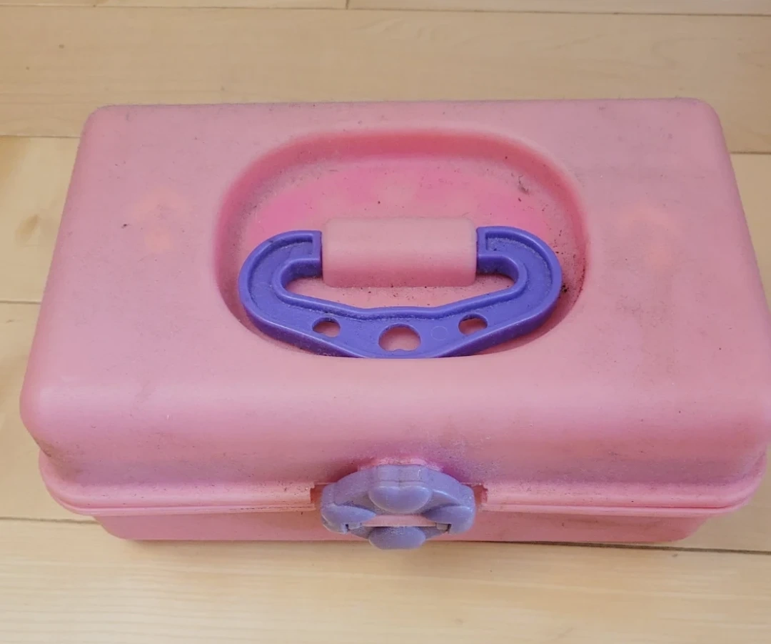 Caboodle pink plastic storage box with a purple handle and clasp, perfect for organizing craft supplies or jewellery. It has multiple compartments to keep items tidy. The lid opens to reveal a mirror.