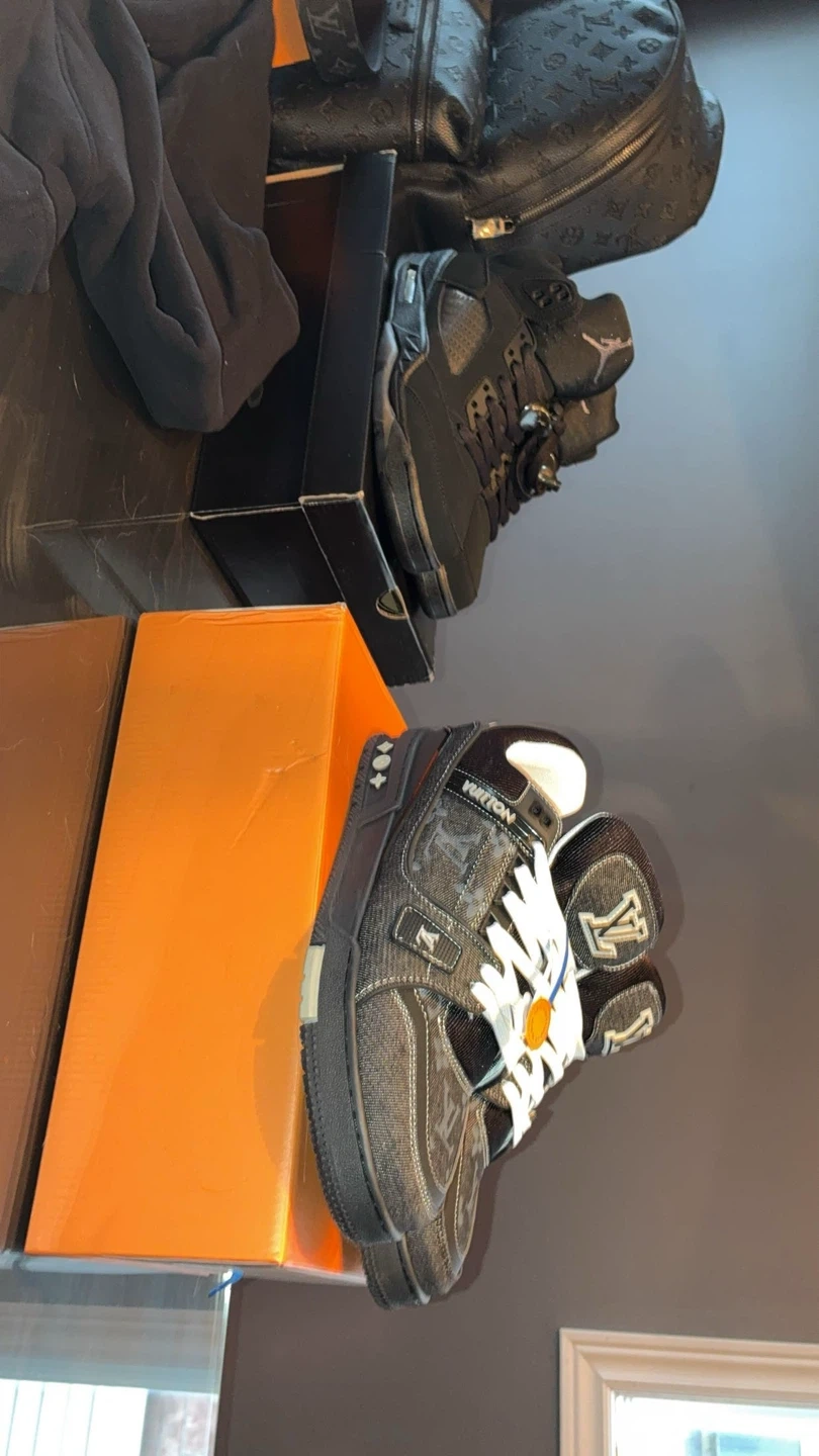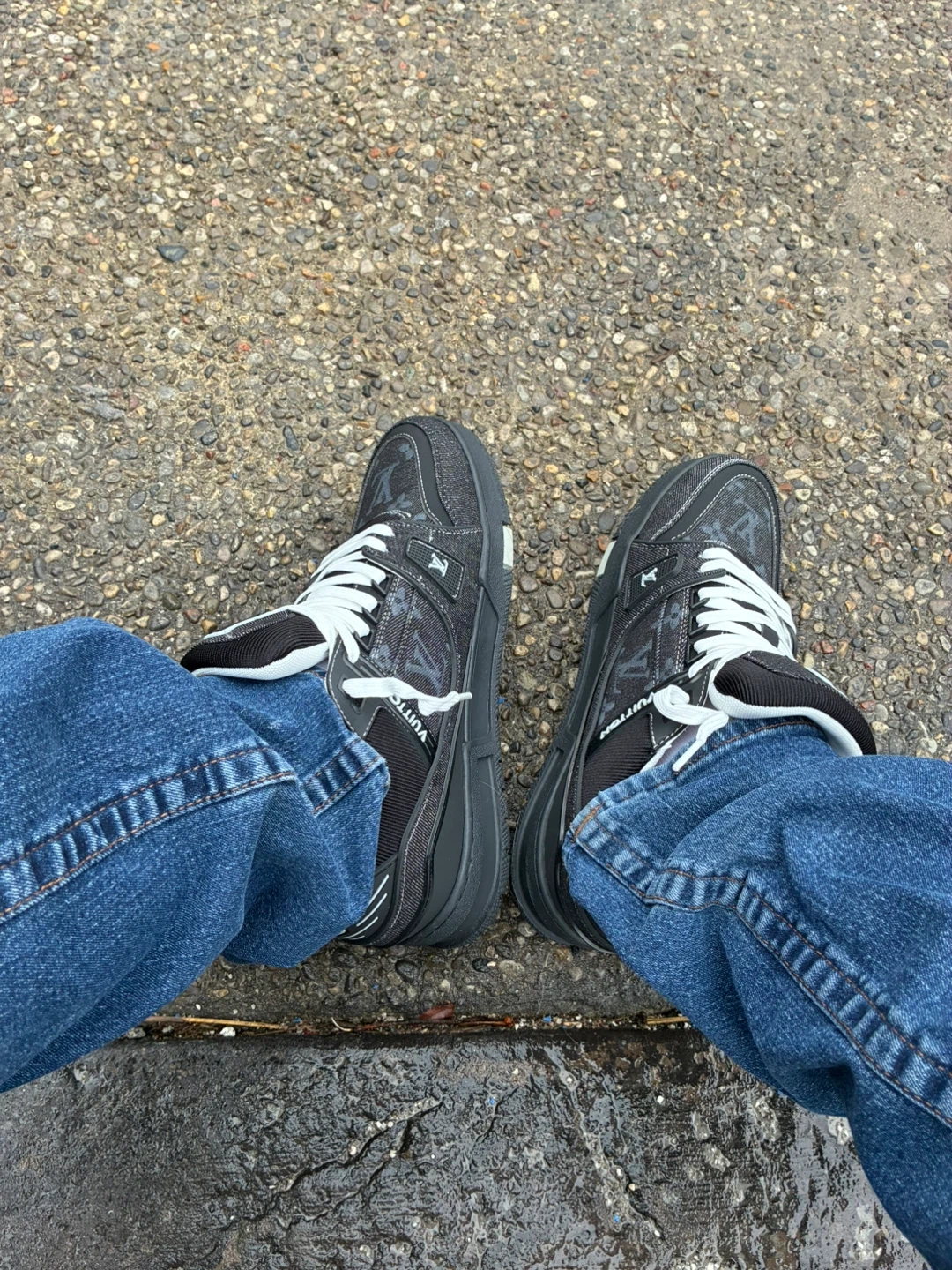 Louis Vuitton black sneakers with white laces. These sneakers feature the signature LV monogram pattern throughout. They're stylish and a great addition to any sneaker collection.