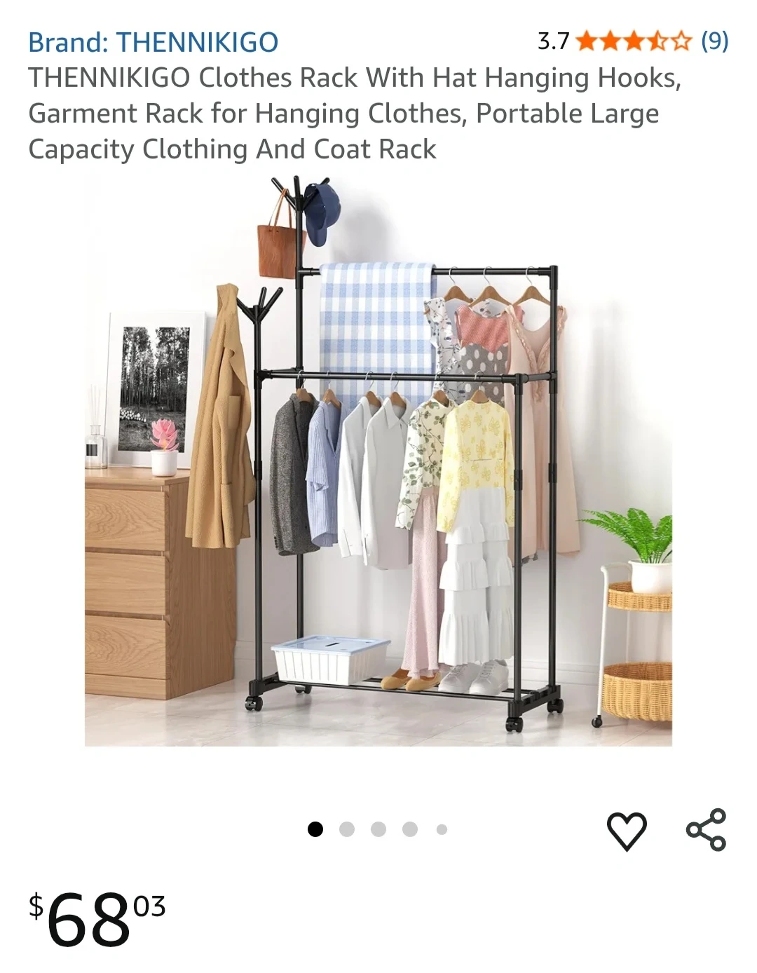 This THENNIkIGO clothes rack offers a double pole for hanging clothes and an extended bottom shelf for storage. It also has additional storage on the side for hats or bags. It's perfect for keeping your garments and accessories organized.