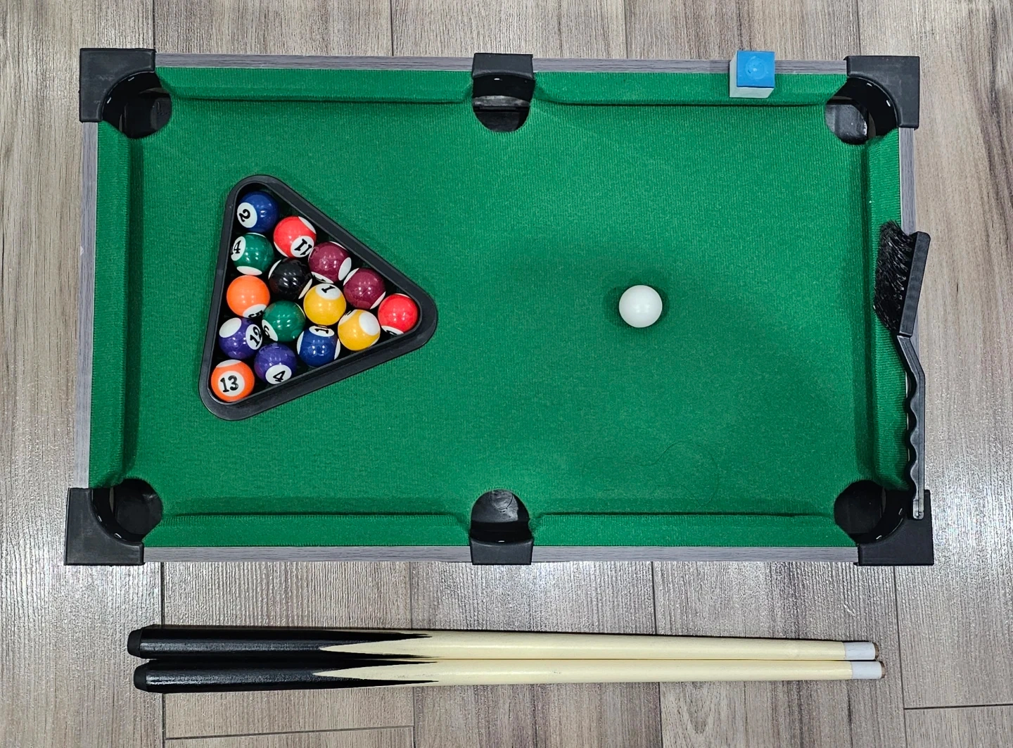 This is a mini pool table set complete with cues and billiard balls. It includes a rack for the balls and a brush for cleaning the felt. Great for quick games and fun!