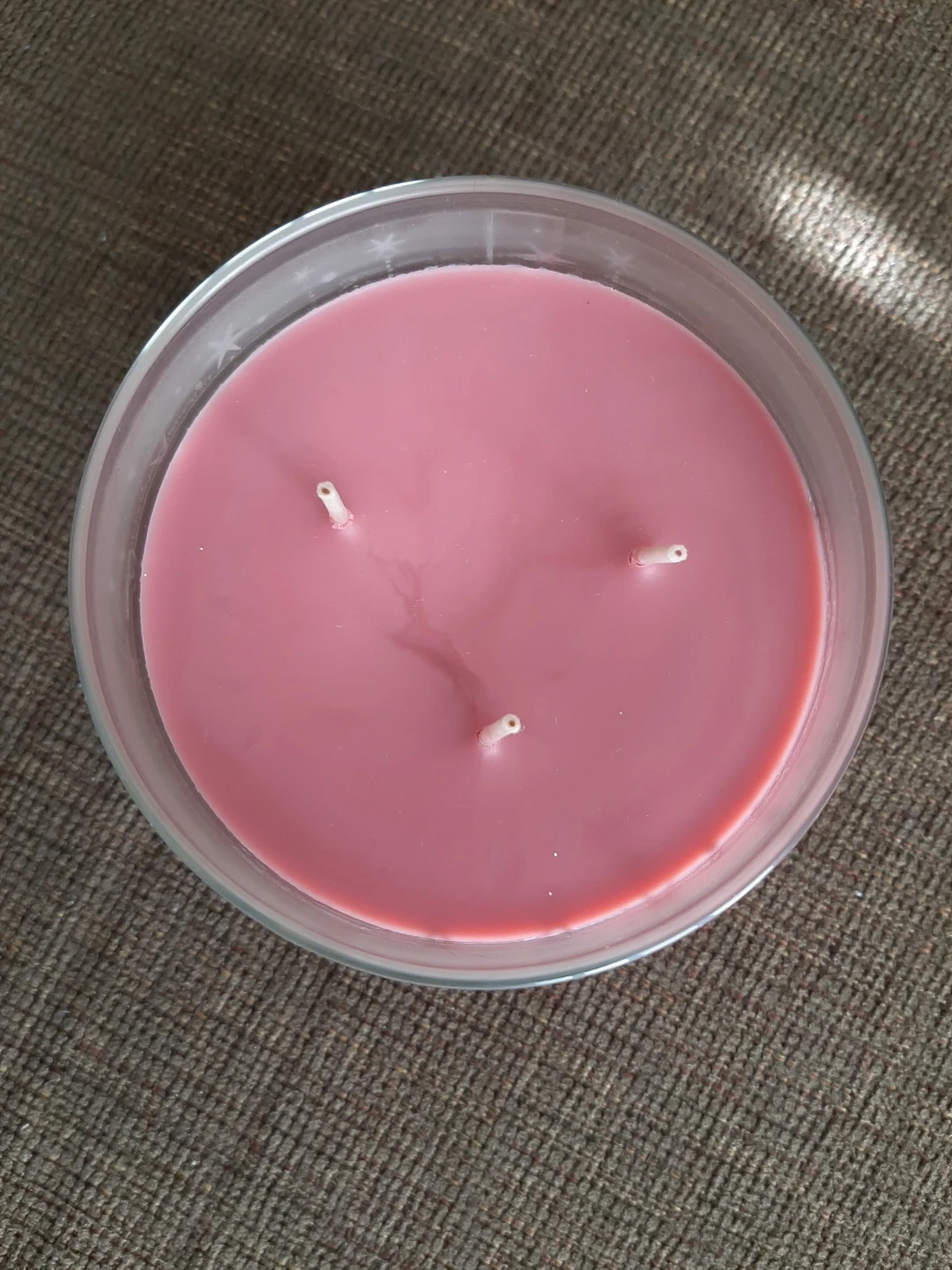 This is a BN Bath & Body Works "Pink Apple Punch" scented candle. It's a large three-wick candle in a glass jar with a metallic lid. The candle is pink with gold star accents.