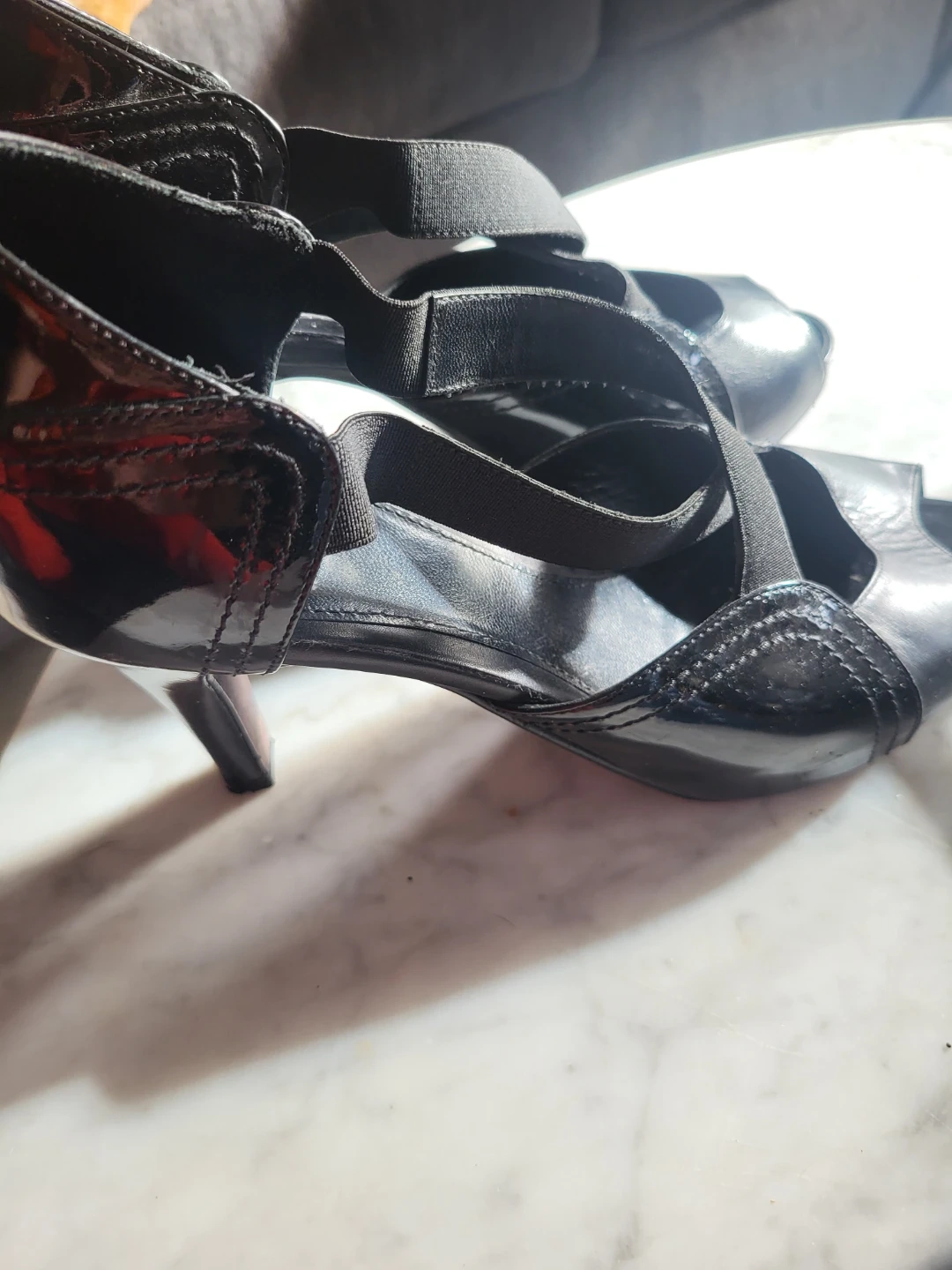 These stylish black peep toe heels are from Dana Davis. Made in Italy, they are a size 10 and feature a comfortable elastic strap design. They've got a sleek patent and leather finish.