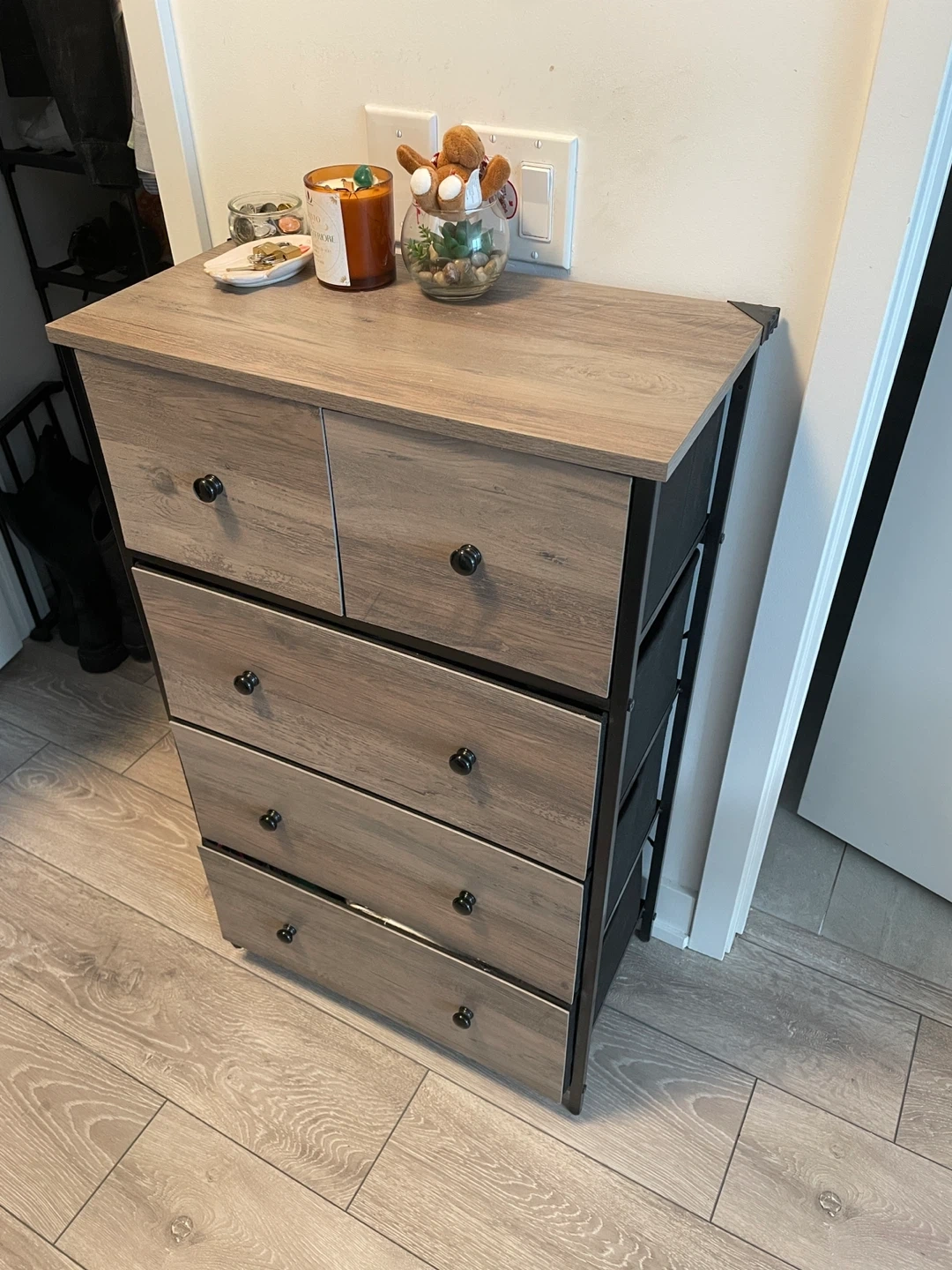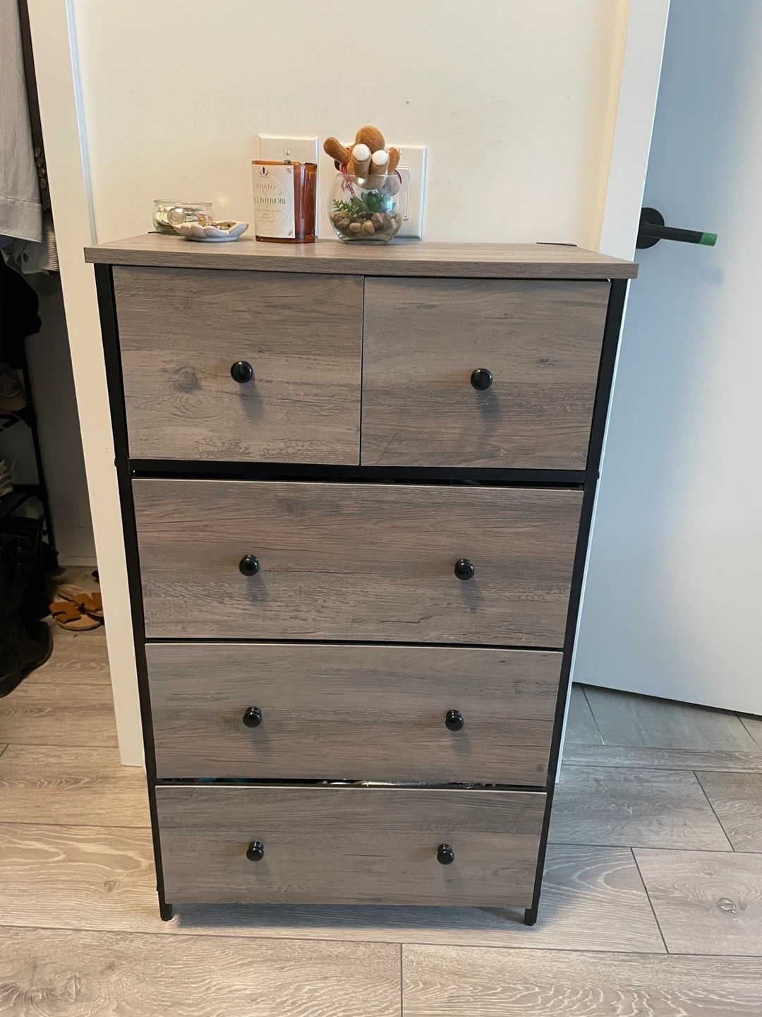 This dresser features a wood grain finish with a black metal frame. It has two smaller drawers at the top and three larger drawers below, with black pull handles. The fabric side panels add a modern touch. We’re selling a dresser in good condition for $80.