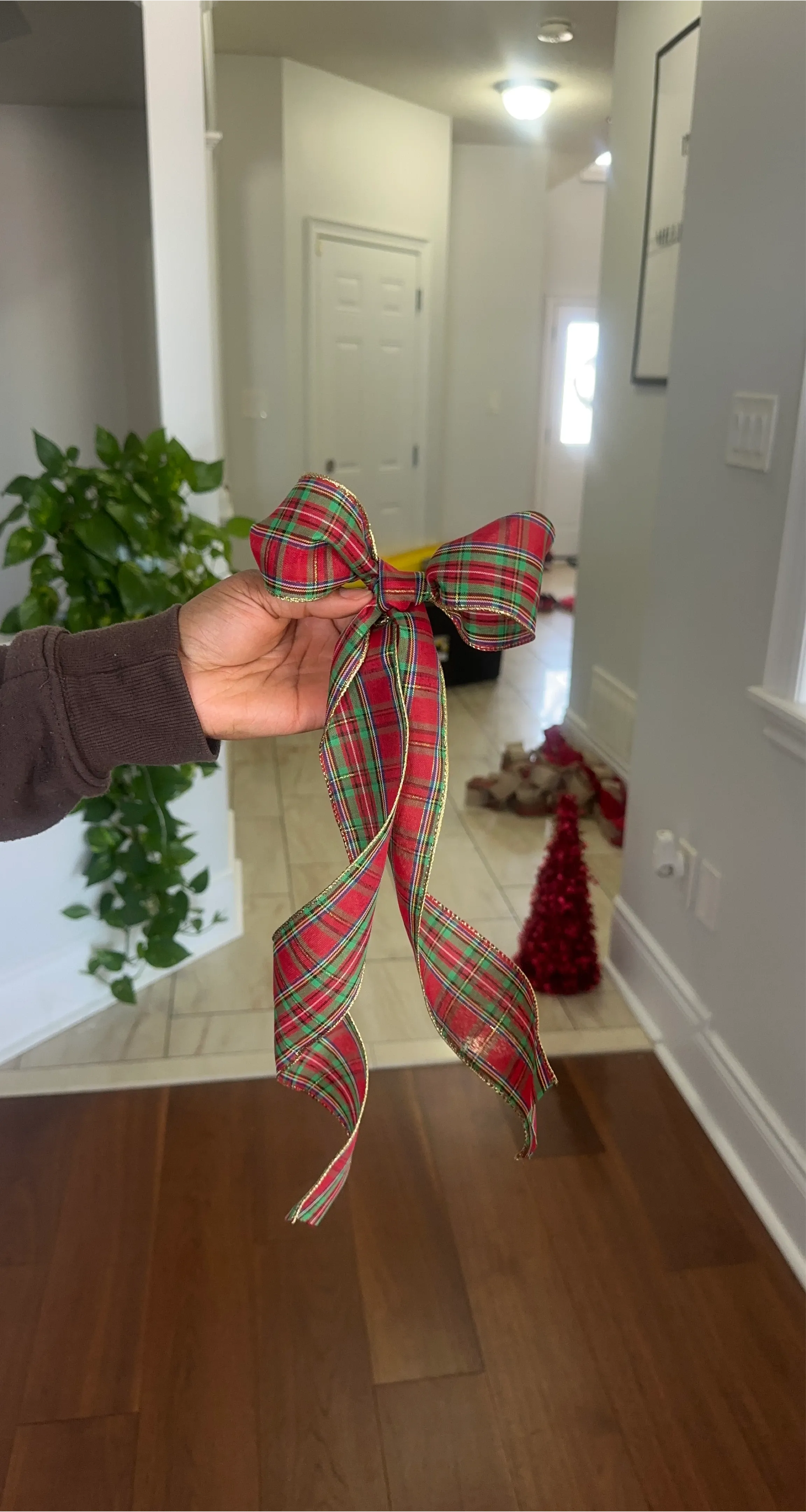 Festive plaid ribbon bow, perfect for decorating your Christmas tree or wreaths. It's made of durable fabric with a classic red, green, and gold pattern. This bow adds a touch of holiday cheer to any seasonal display!