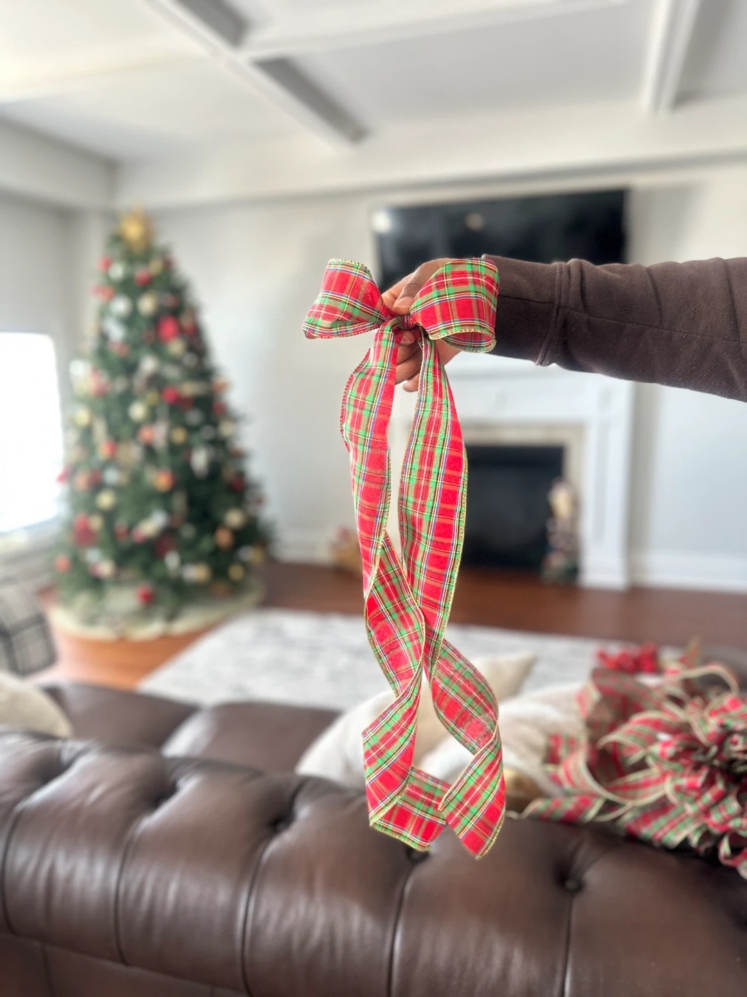 Festive plaid ribbon bow, perfect for decorating your Christmas tree or wreaths. It's made of durable fabric with a classic red, green, and gold pattern. This bow adds a touch of holiday cheer to any seasonal display!