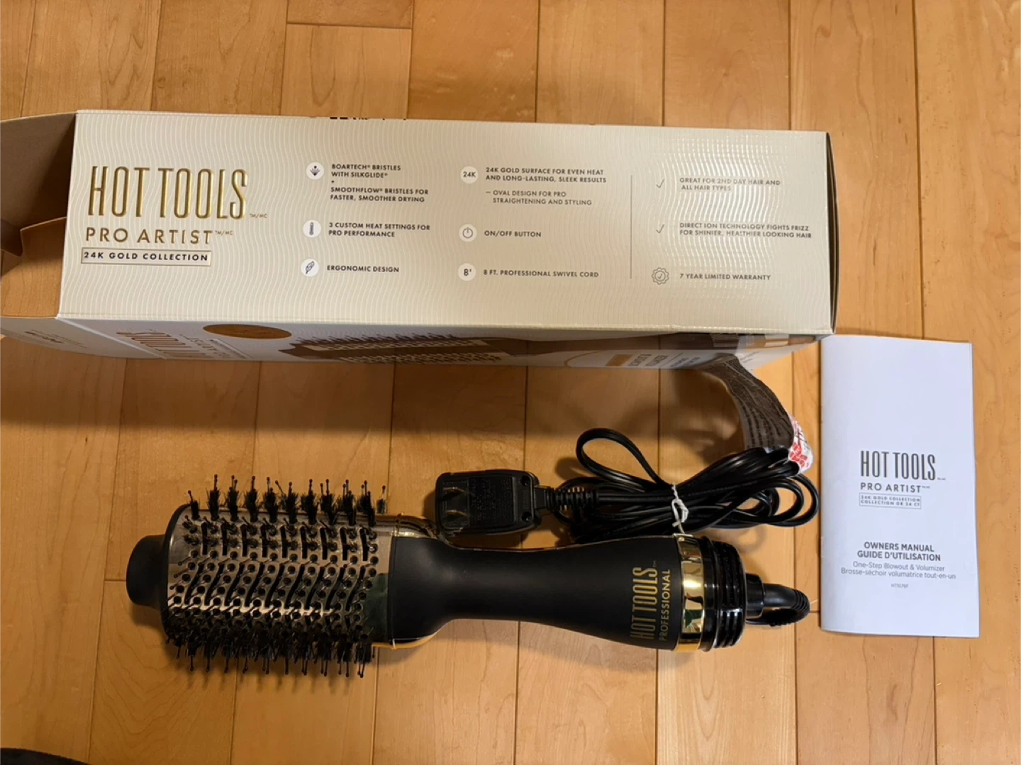 Hot Tools Pro Artist 24K Gold Collection One-Step Blowout & Volumizer. It's designed for faster, smoother styling. Includes owner's manual. It has Boartech bristles and 24K gold surface for even heat.
