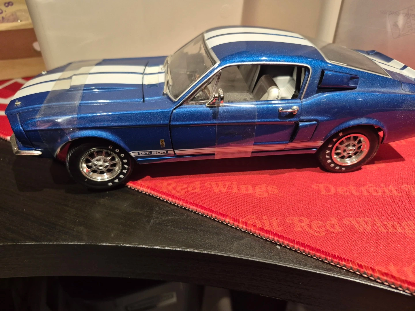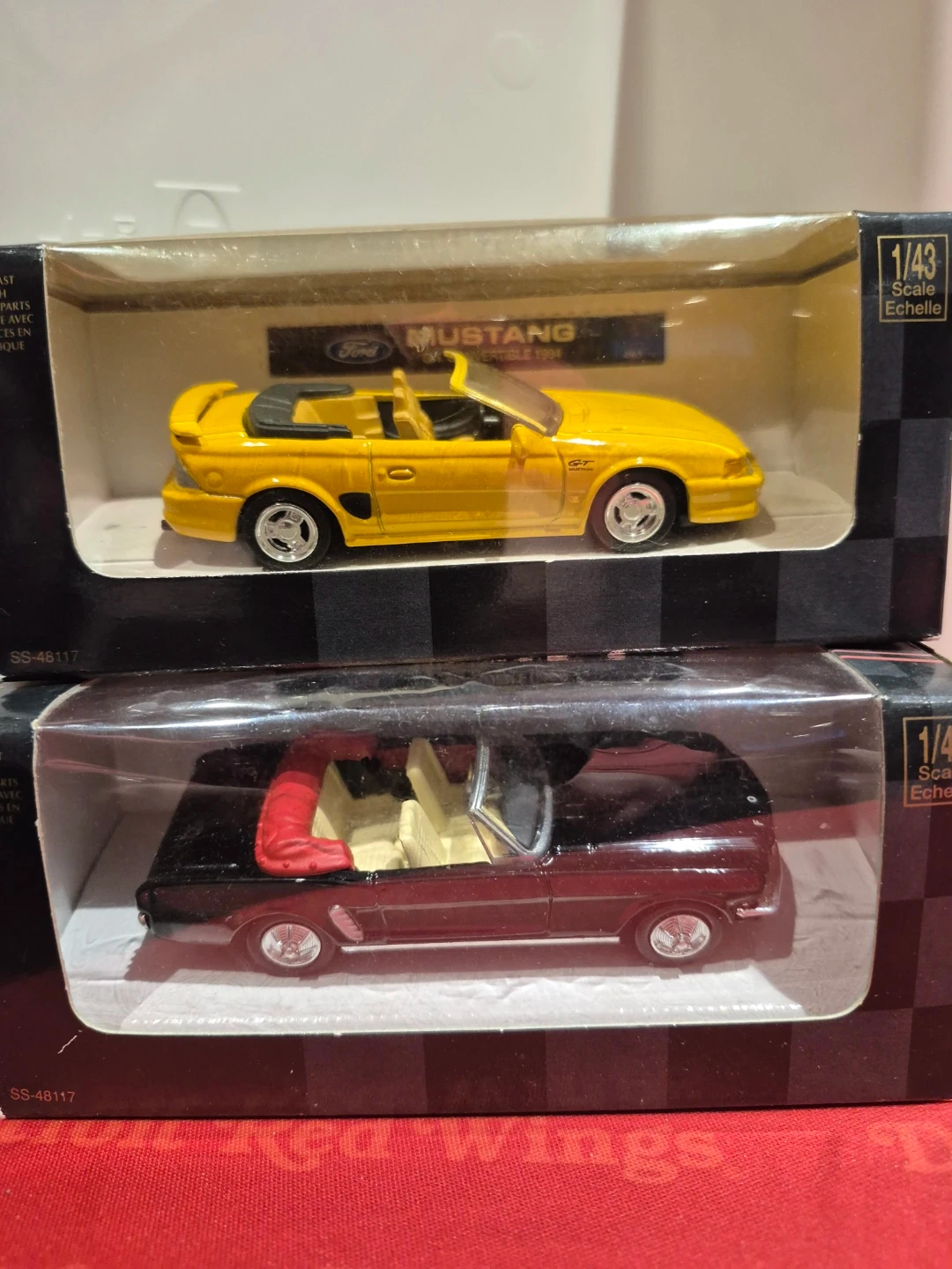 Collection of Ford Mustang diecast model cars, including a yellow 1994 convertible and a blue Shelby GT500. Also includes the "Mustang: Forty Years" book by Randy Leffingwell. Great for any car enthusiast!