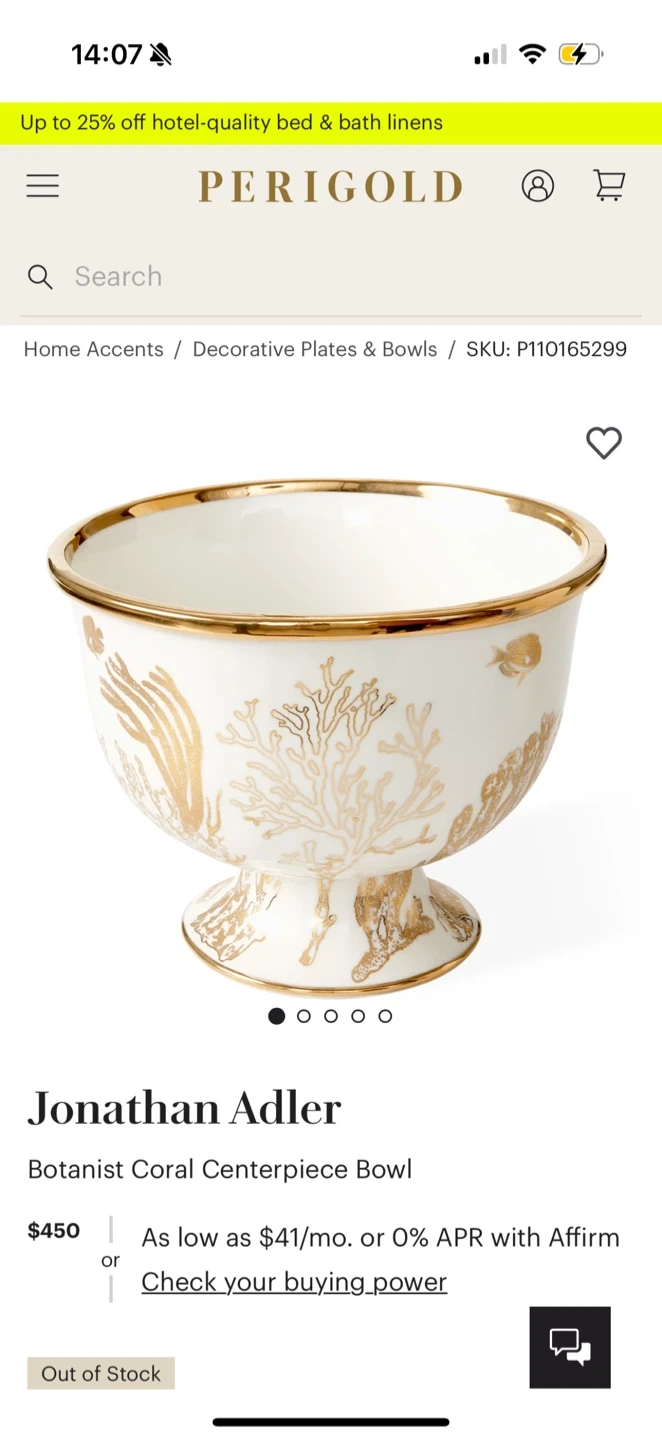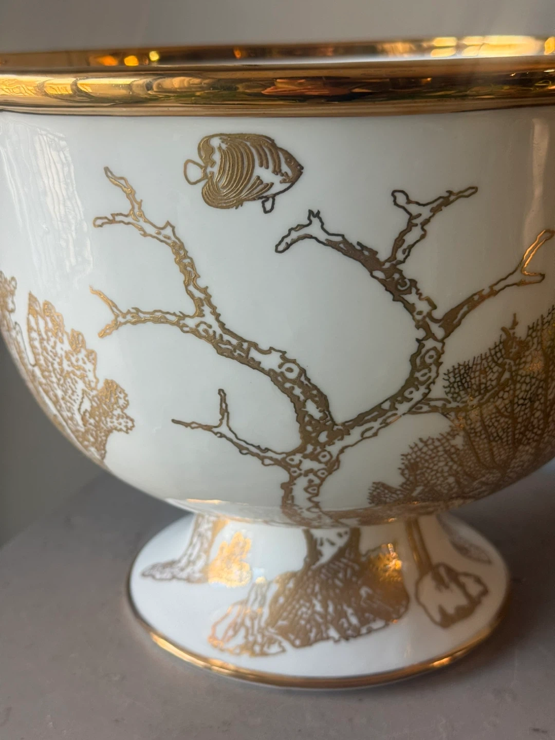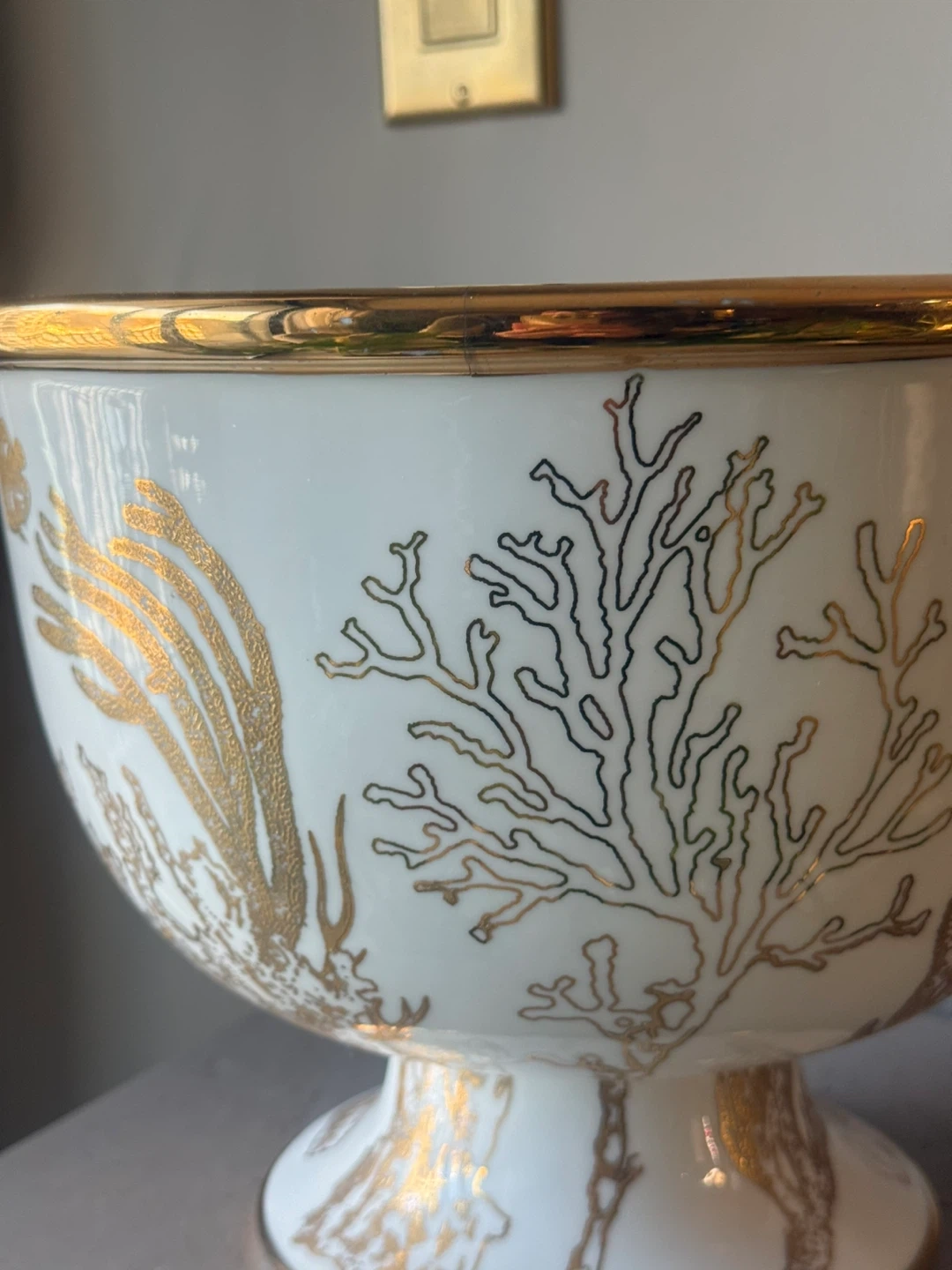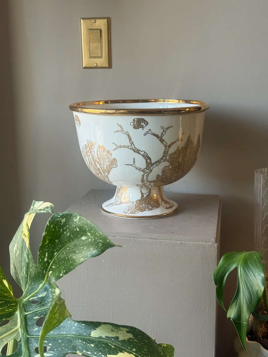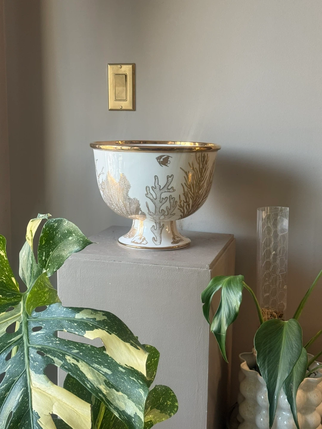 Jonathan Adler Botanist Coral Large pedestal bowl, it’s a generously sized porcelain centerpiece bowl, wrapped in shimmering gold silhouettes and finished with a glossy touch. A rich hippie must-have for your table, console, or counter. Retailed for $450+Tax