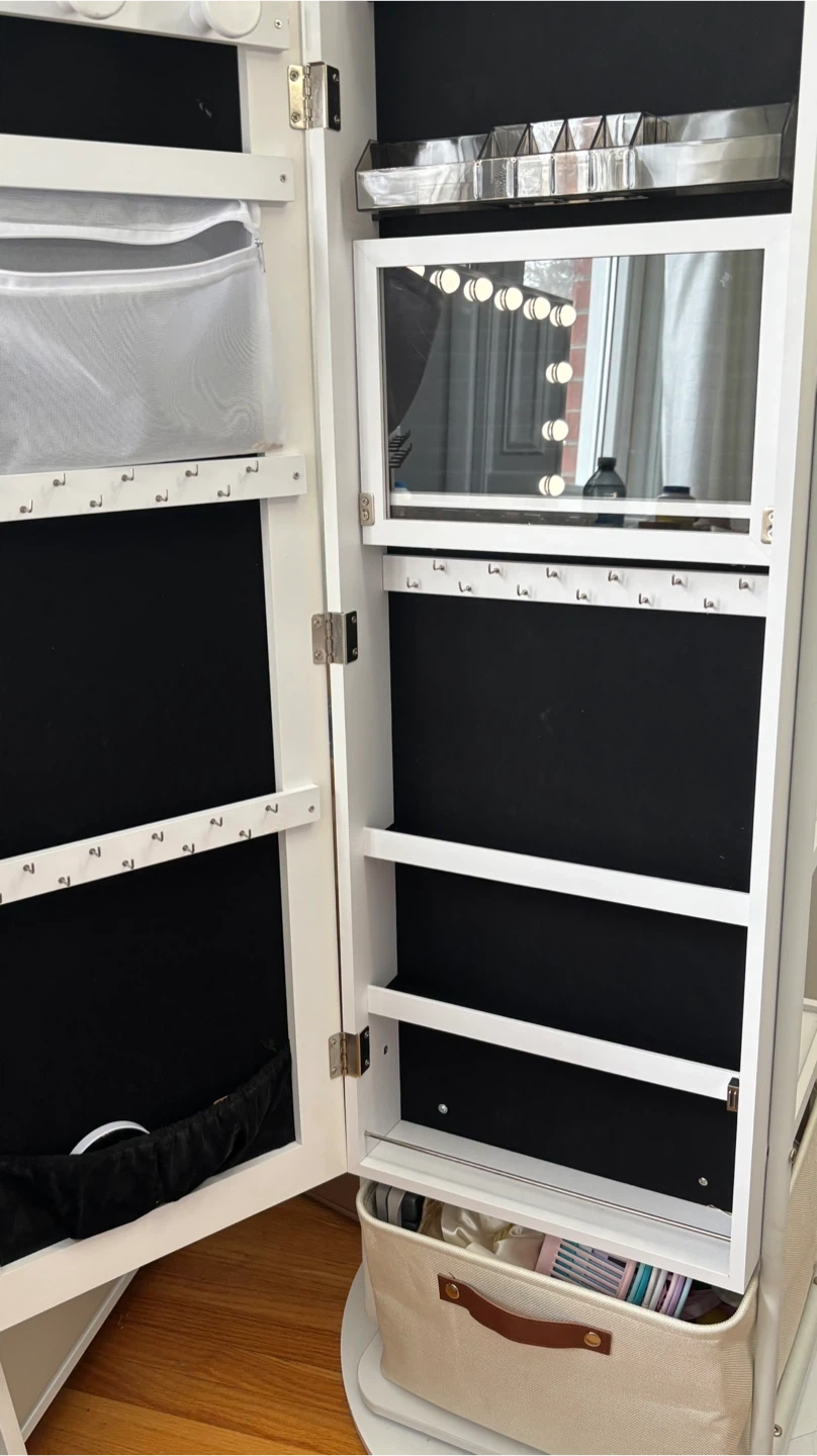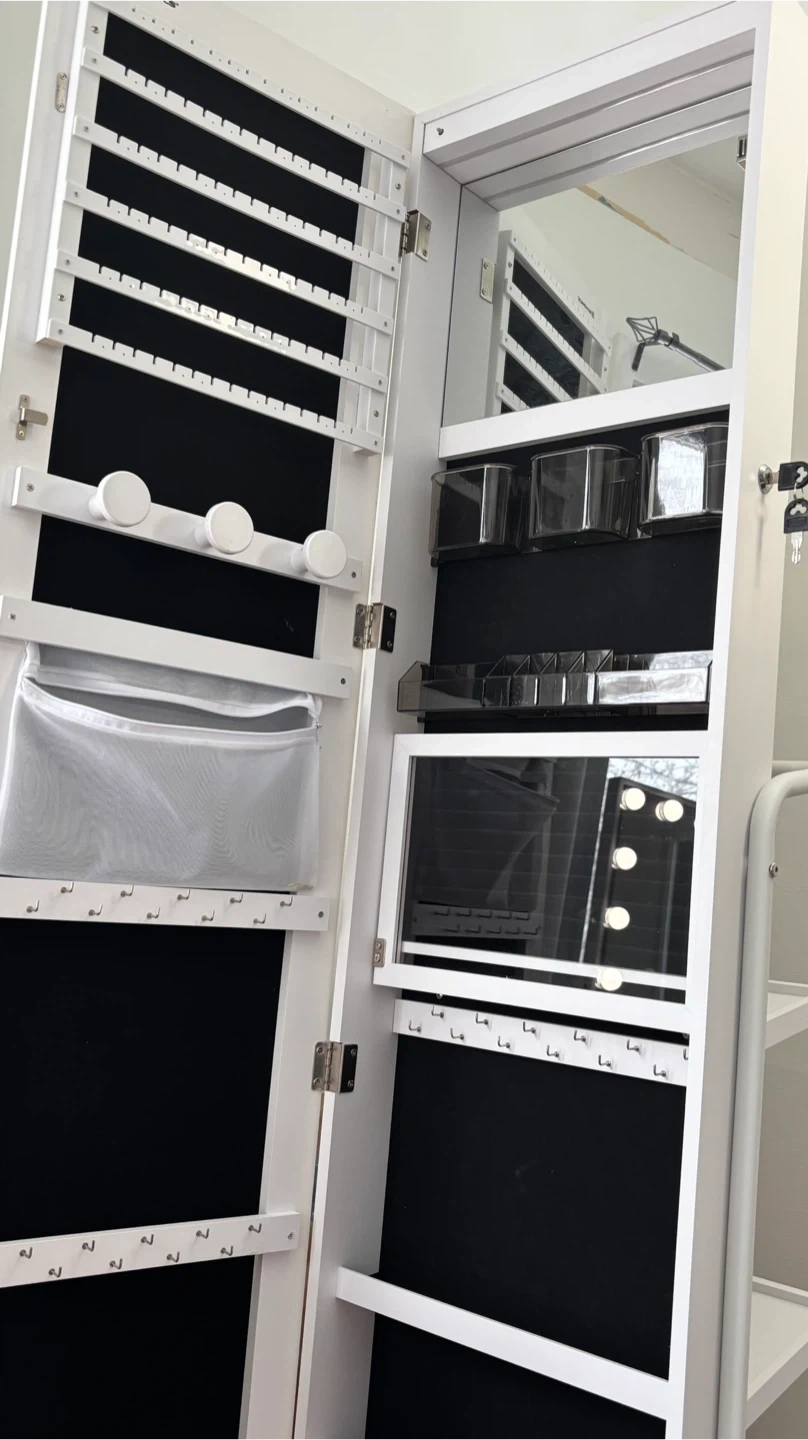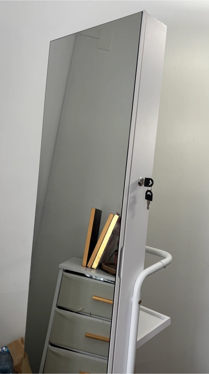 Description: White standing jewelry armoire featuring a full-length mirror. It has multiple compartments and hooks for organizing jewelry and accessories. It also includes a lock with keys to secure your belongings.