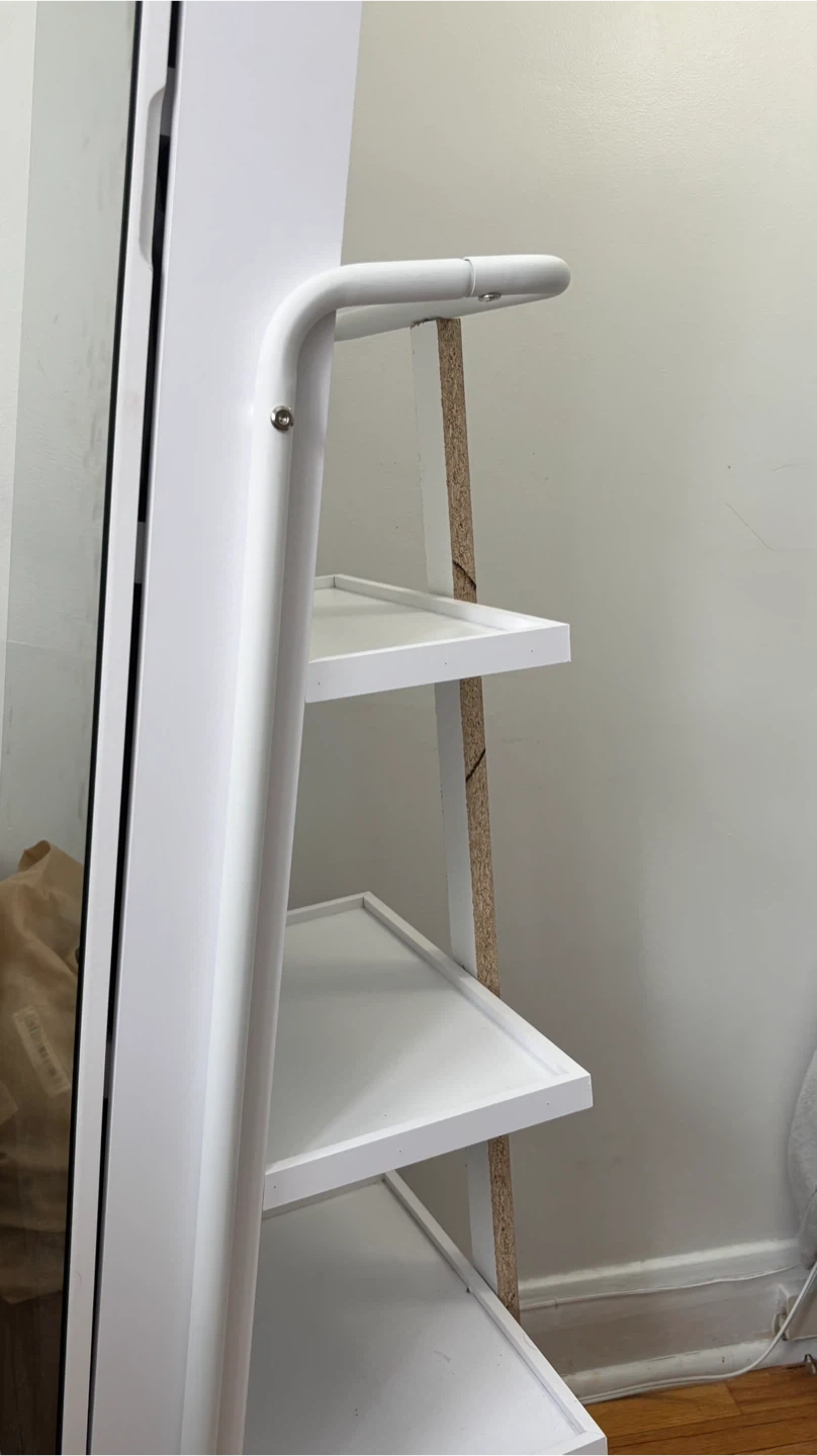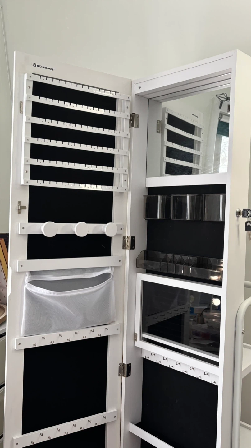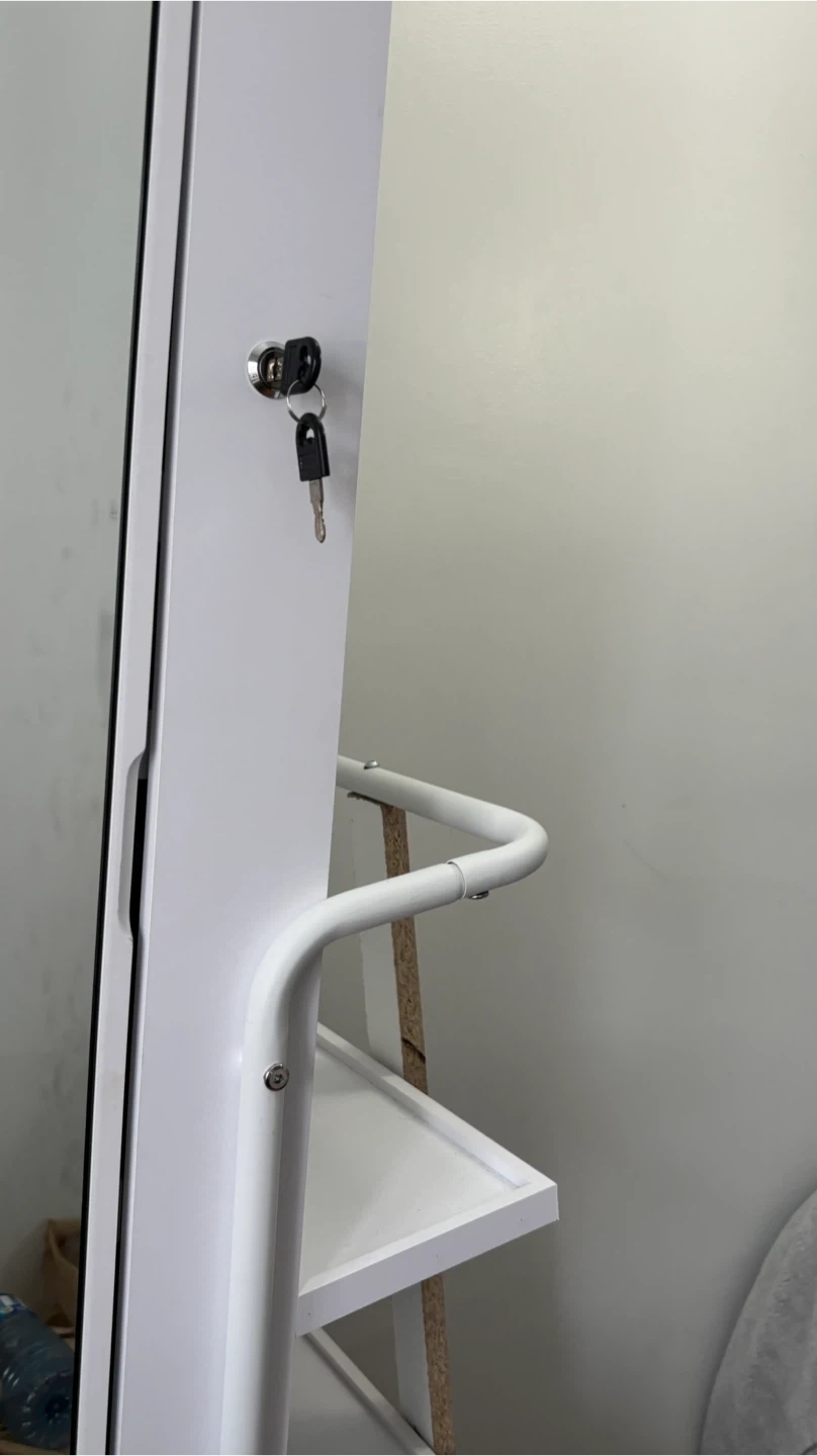 Description: White standing jewelry armoire featuring a full-length mirror. It has multiple compartments and hooks for organizing jewelry and accessories. It also includes a lock with keys to secure your belongings.