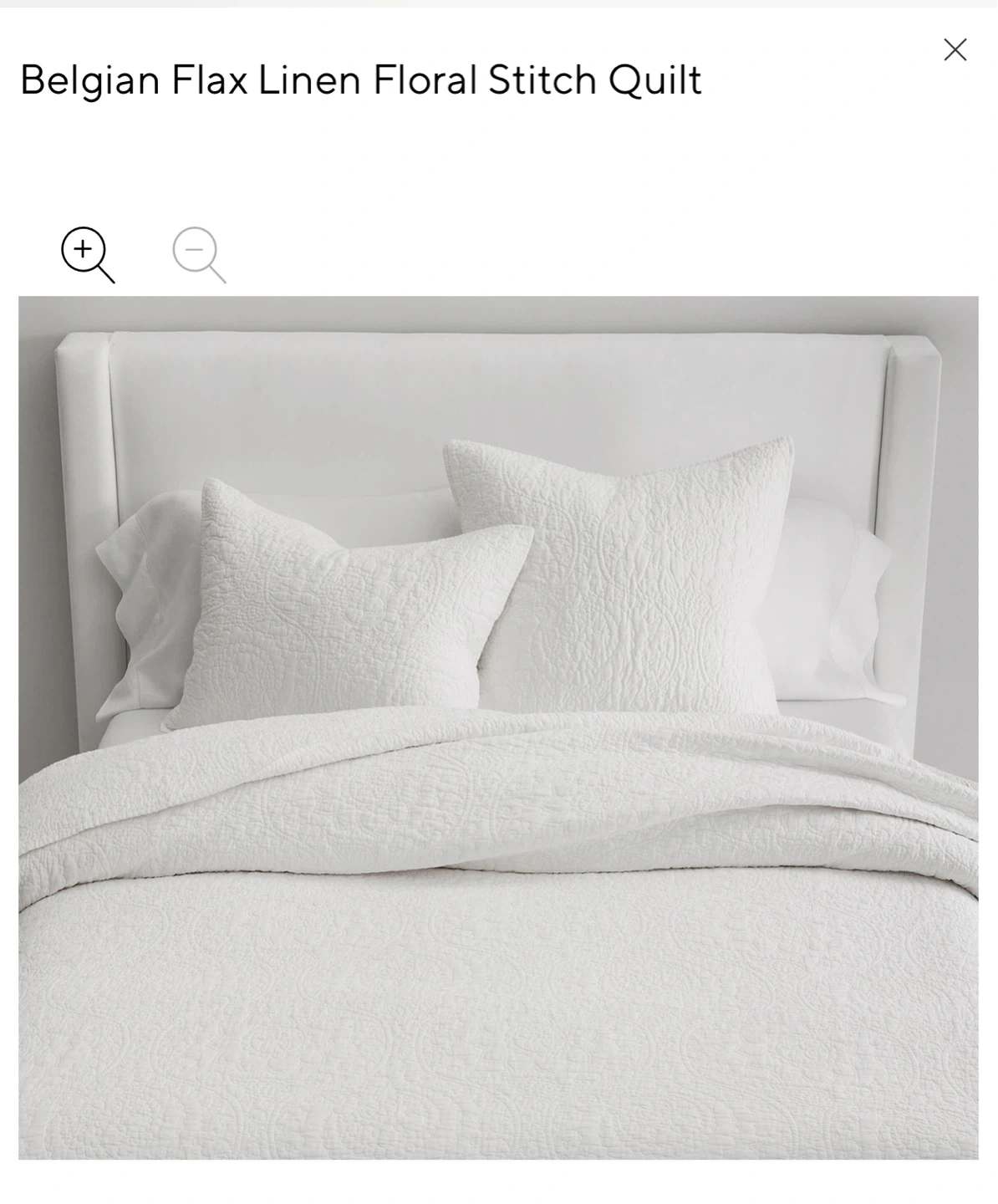 This Belgian Flax Linen quilt features a beautiful floral stitch pattern. It's made from 100% Belgian flax linen, known for being breathable and getting softer with every wash. This quilt is perfect for adding a touch of elegance and comfort to your bedroom.