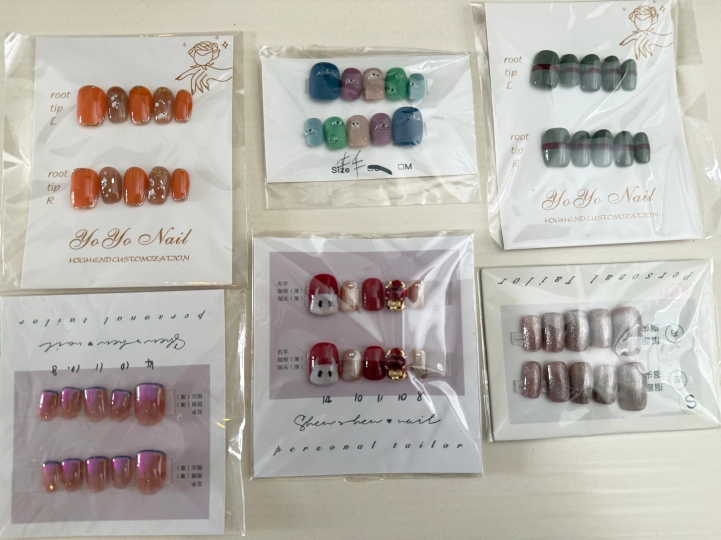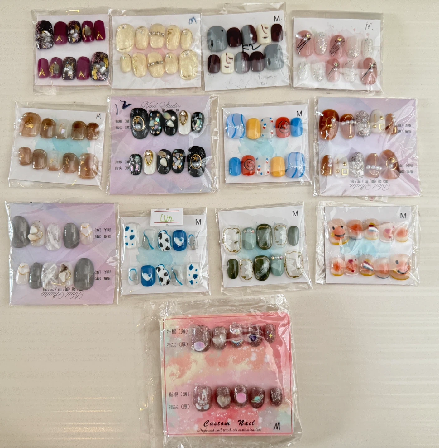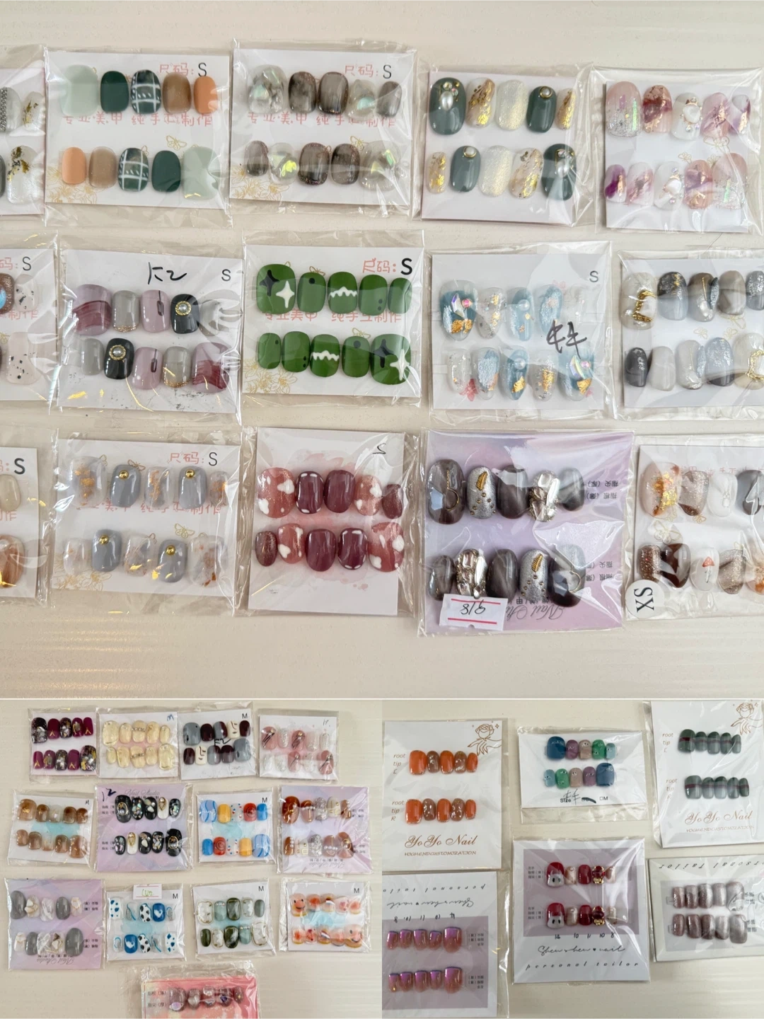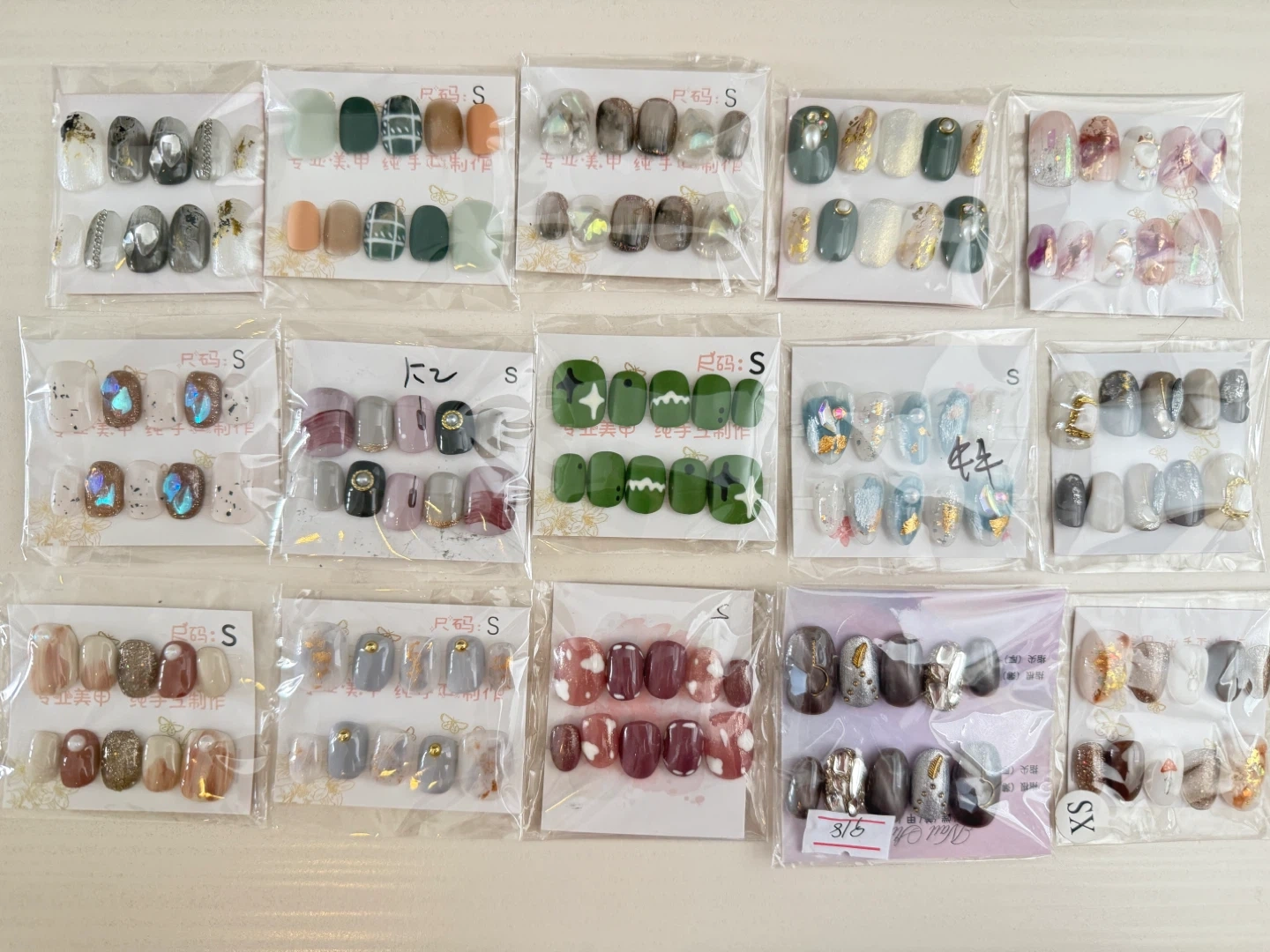 A collection of press-on nails featuring a wide variety of designs, colours, and finishes. Most sets are marked with 'S' or 'M' for size. Each package contains a full set of nails.