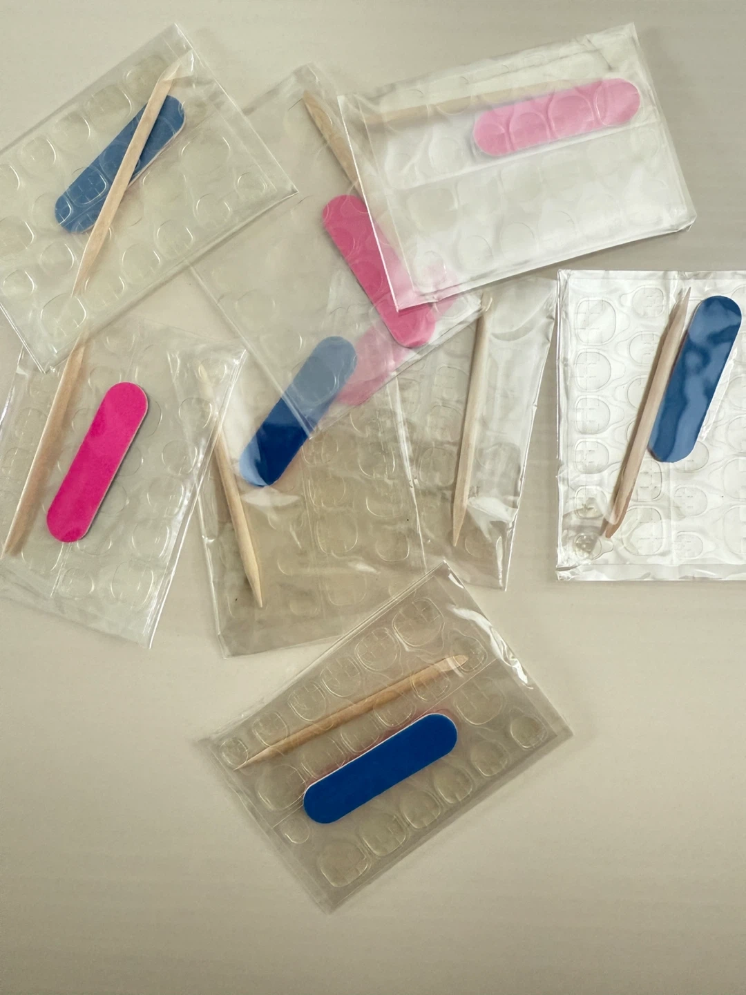A collection of press-on nails featuring a wide variety of designs, colours, and finishes. Most sets are marked with 'S' or 'M' for size. Each package contains a full set of nails.