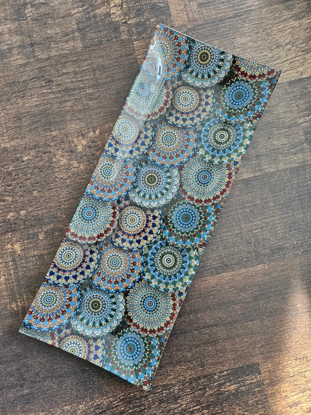 This rectangular tray showcases a vibrant mandala-inspired design in shades of blue, red, and gold. It's made of a clear, durable material with a glossy finish. Use it to serve snacks or display decorative items.