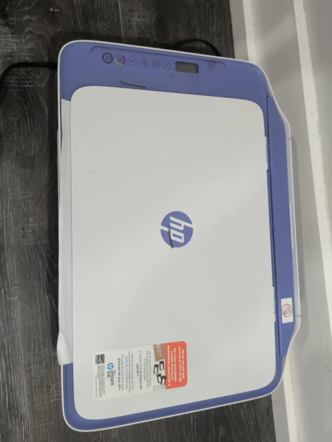This is an HP all-in-one printer with Instant Ink. It offers printing, scanning, and copying capabilities. The printer comes with a 6-month trial of Instant Ink, providing ink delivery and recycling starting at $1.25 CAD per month. This printer is useful for home or small office needs.