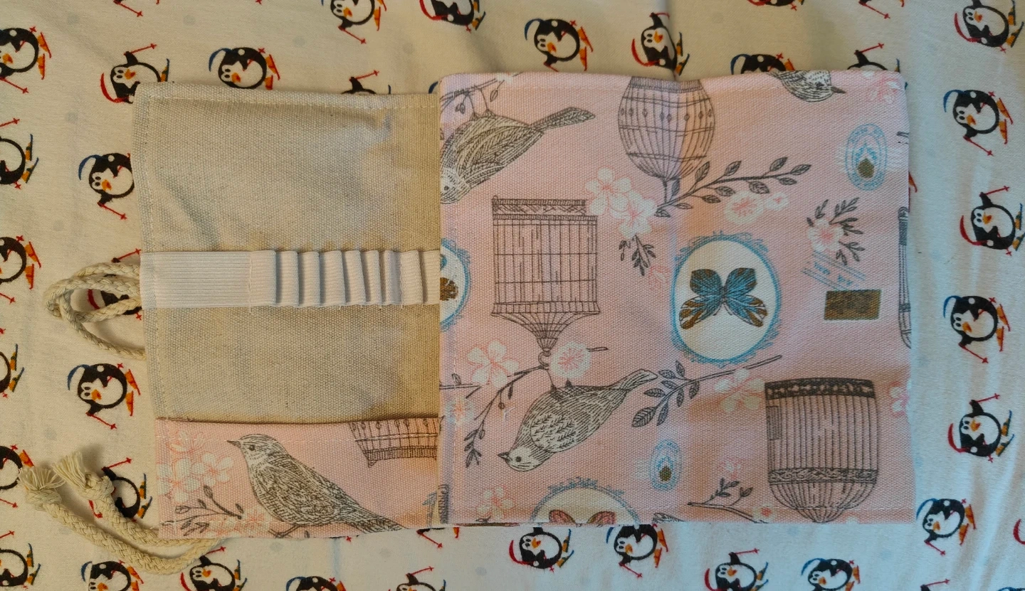 This fabric pencil roll case has a charming bird and cage print on the outside. It features elastic loops inside to hold pens or pencils securely. It's perfect for artists or students to keep their writing tools organized.