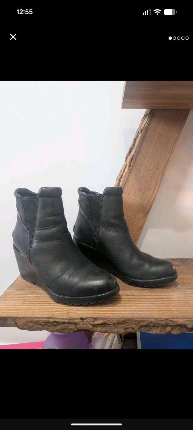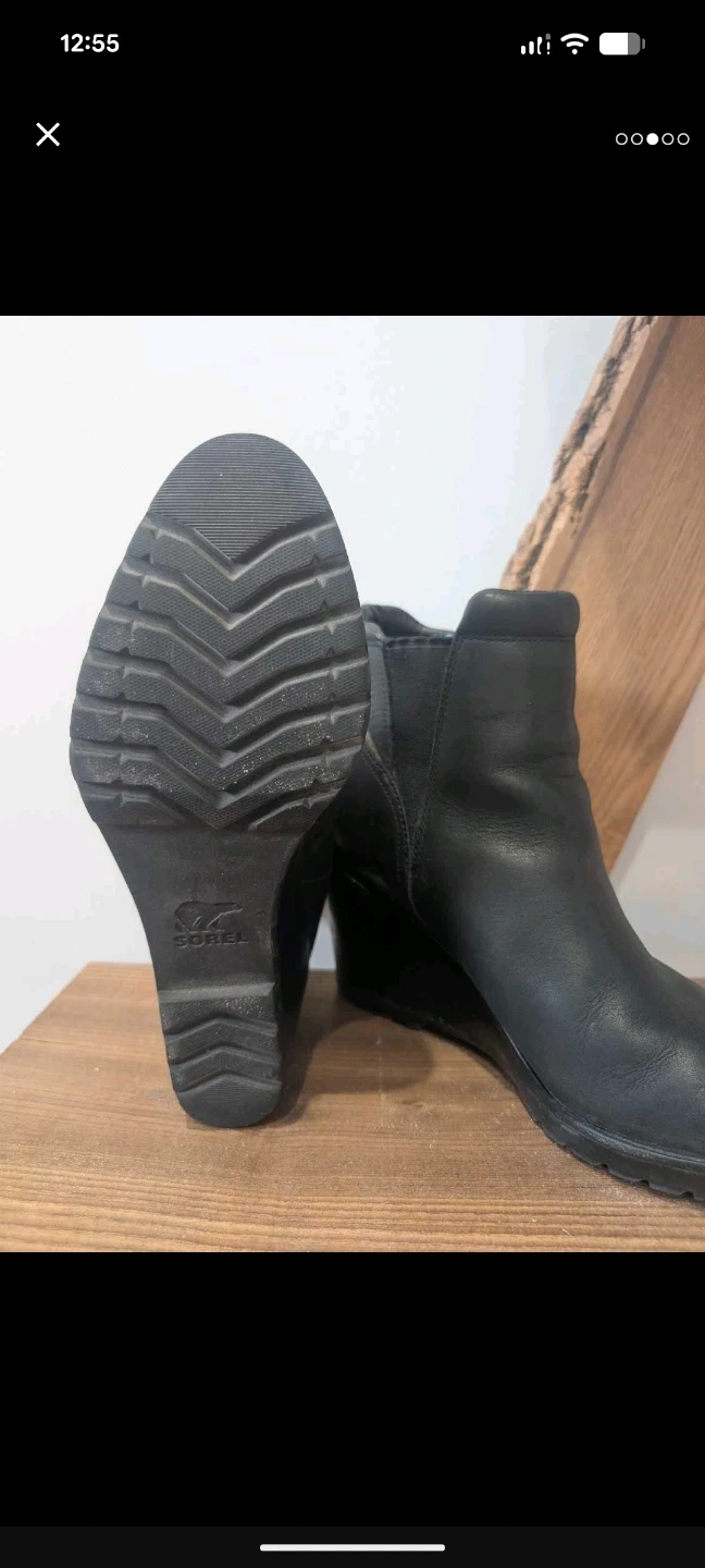 These are Sorel black leather wedge ankle boots. Size is US 10. Lots of life left, they need a new home