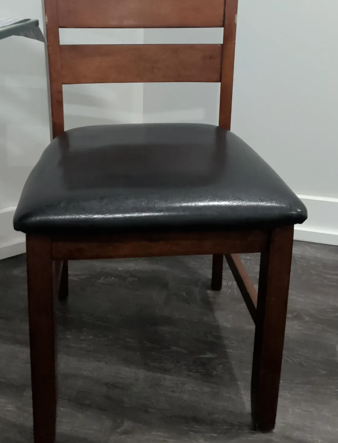 This is a sturdy wooden dining chair with a comfortable black padded seat. The wood has a warm, rich tone. It's a classic design that'd fit many decors. A great option for any dining room or kitchen table!