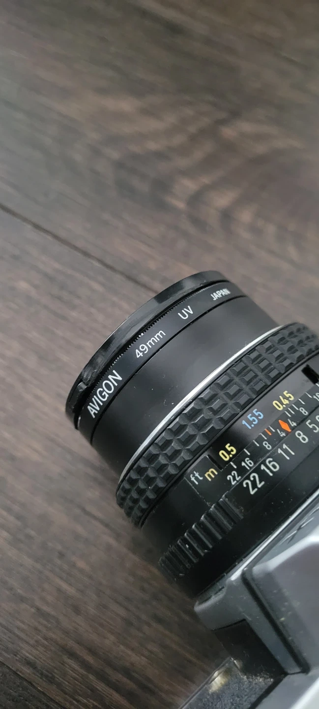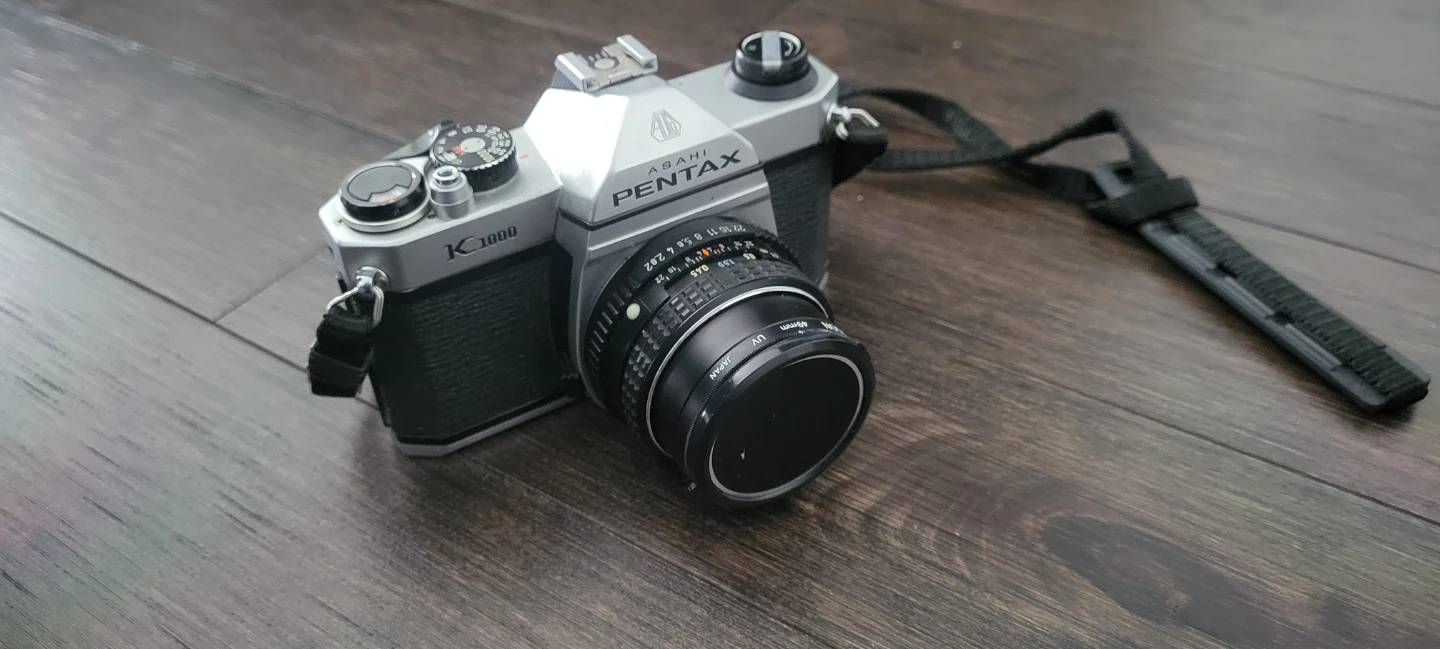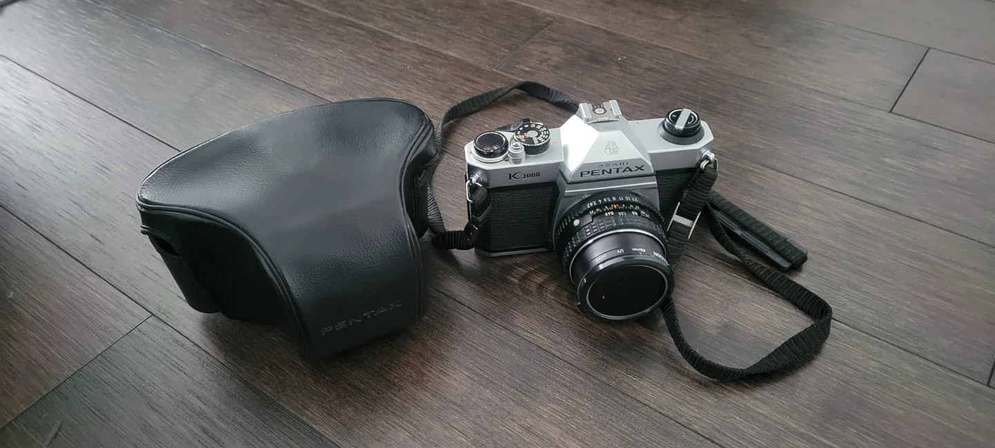 This is a Pentax K1000 35mm film camera. It's a classic SLR camera, great for learning photography. Comes with a lens and a protective case.