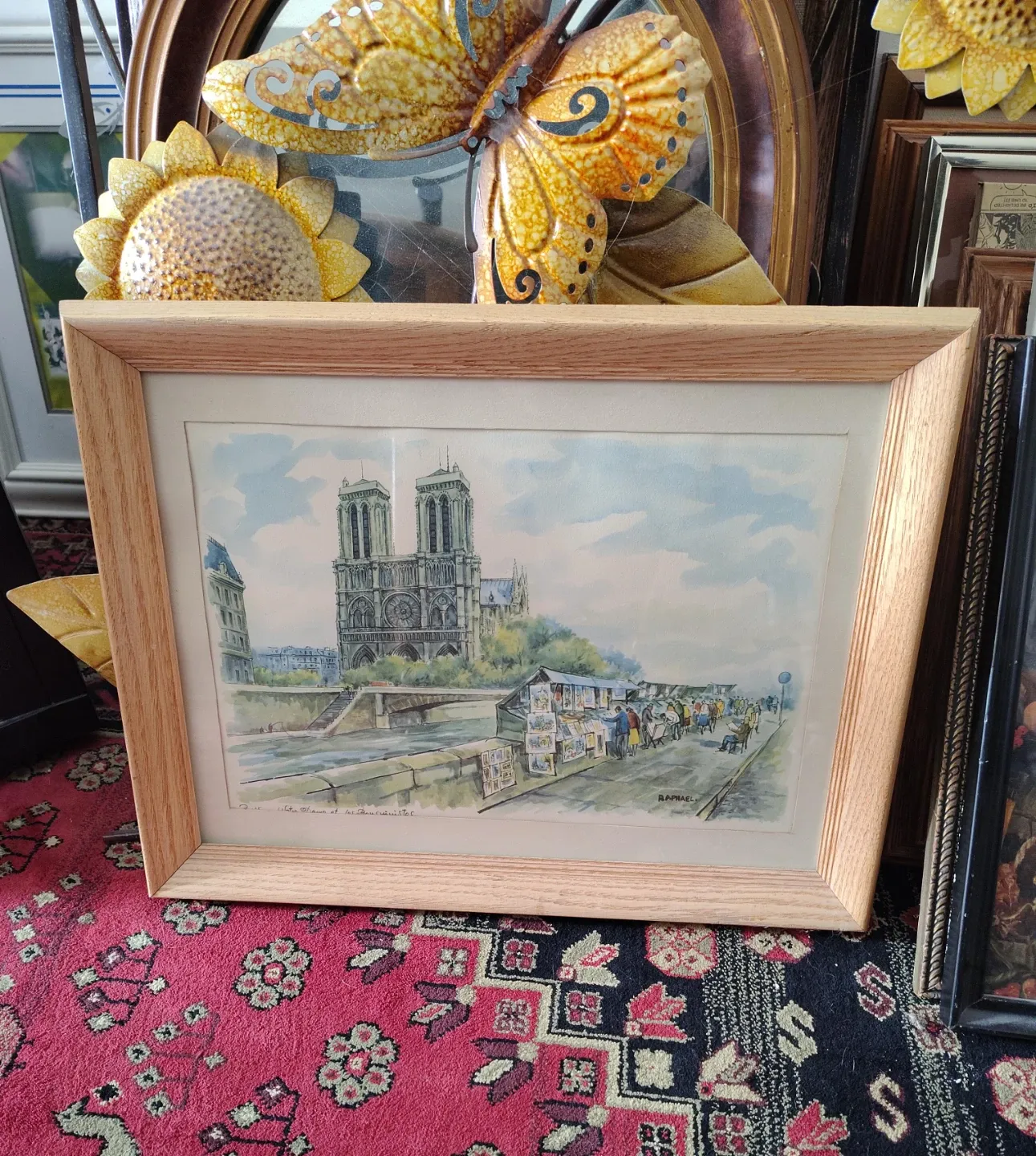 Framed watercolor painting depicting Notre Dame Cathedral and the Seine River. It's signed by the artist 'Raphael' and titled 'Notre Dame et les bouquinistes'. The frame is light wood. This piece would add a touch of Parisian charm to any room.