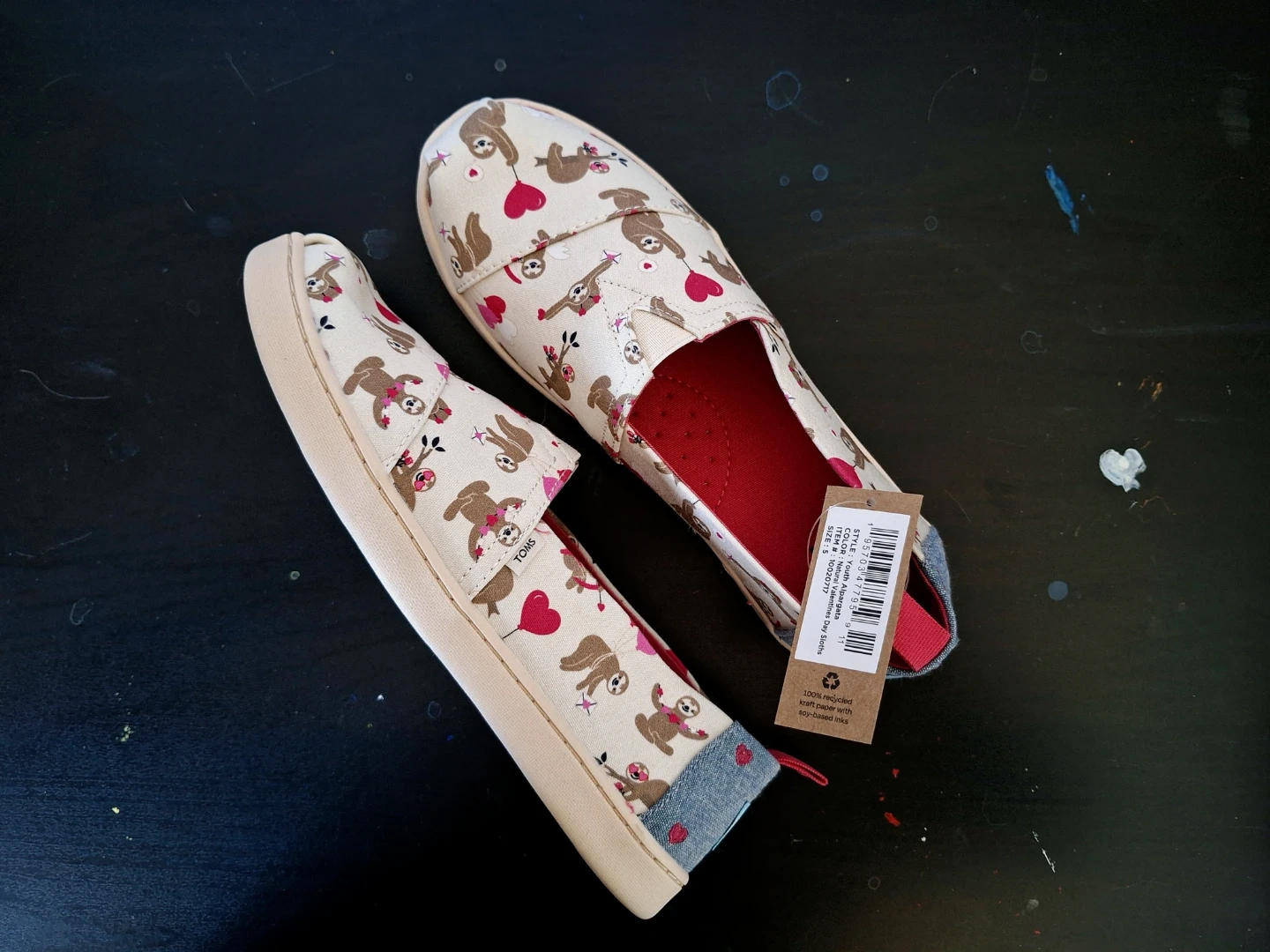 These are a pair of TOMS Youth Alpargatas in a "Natural Valentines Day Sloths" print. They're Big Kid's size 5 / Women's size 6.5.