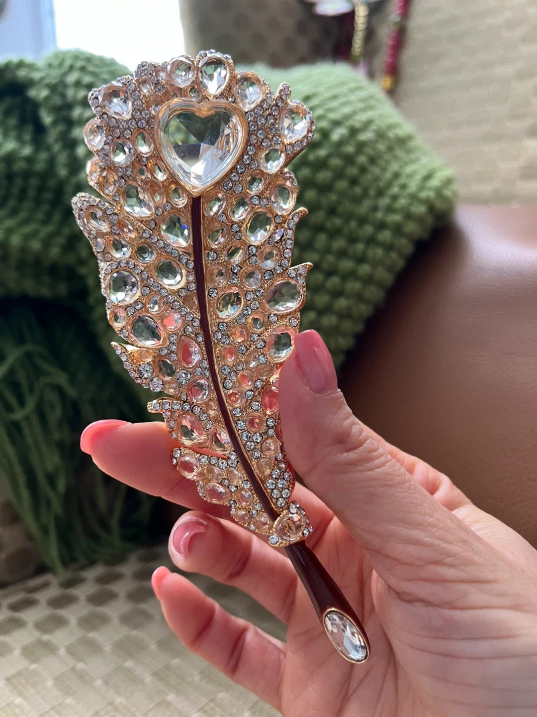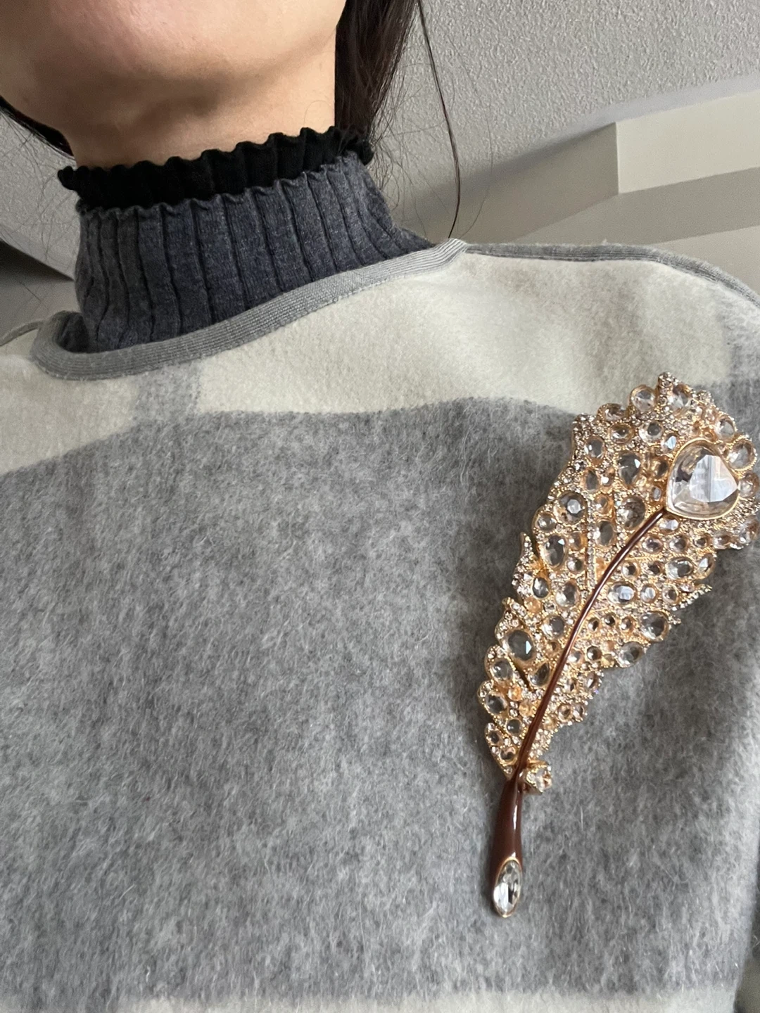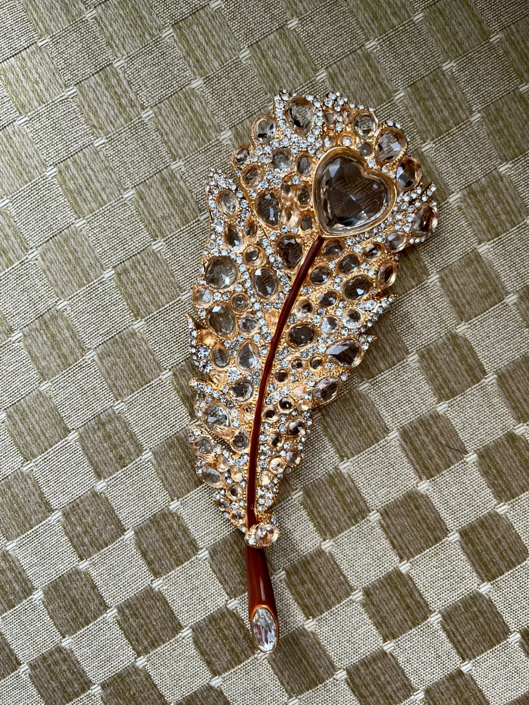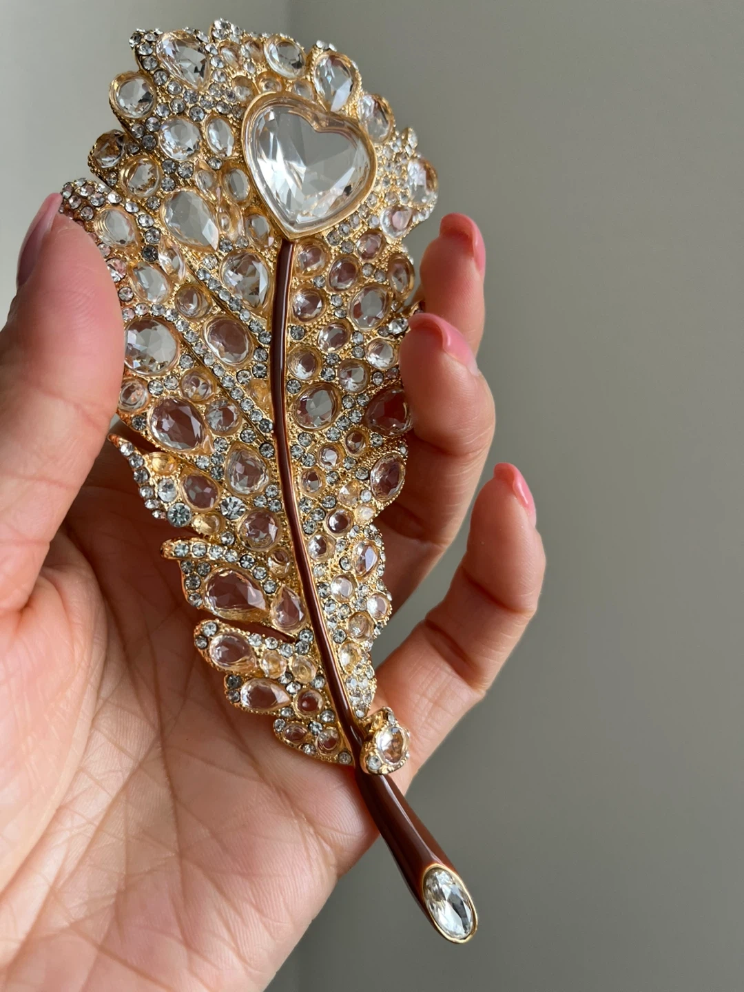 This decorative brooch is designed like a feather and encrusted with clear crystals. It features a prominent heart-shaped crystal at the top. The metallic base has a gold-tone finish.