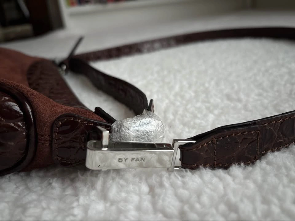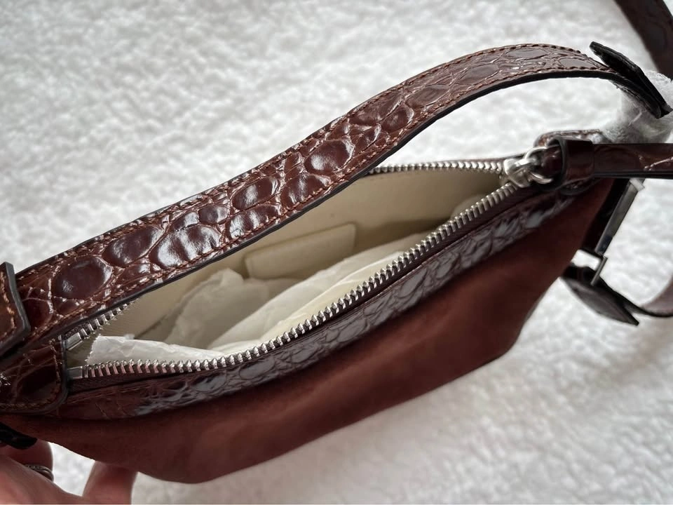 NEW BY FAR Mini Ami shoulder bag in sequoia brown crocodile-embossed leather and suede. Still has original wrapping.